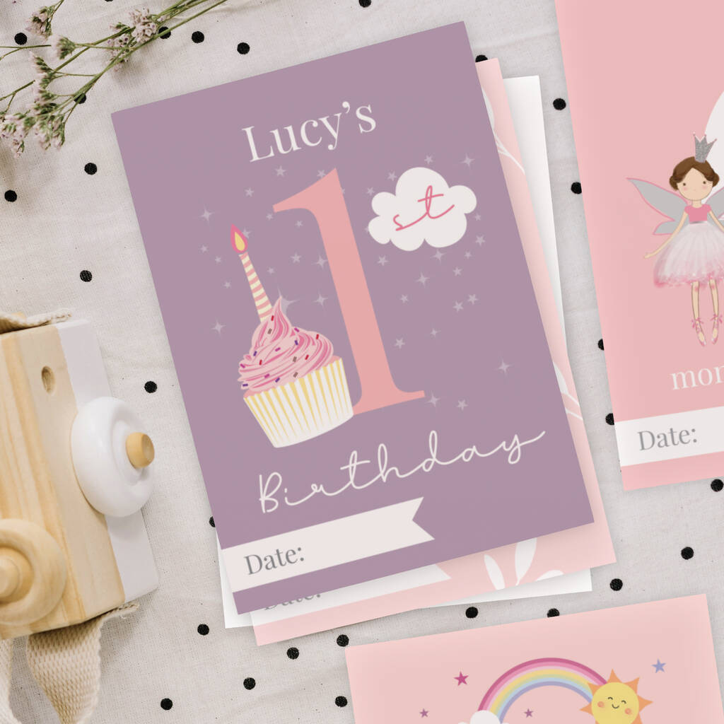 Celebrate every beautiful step of your daughter's journey with our exquisite set of Personalised Baby Girl Milestone Cards. Designed in soft, delicate pastels with enchanting illustrations, these cards are the perfect way to remember those fleeting, precious moments, from the first smile to the first birthday.