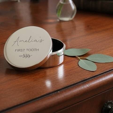 Our Personalised First Tooth Trinket Box is an ideal place to store a baby's first tooth.