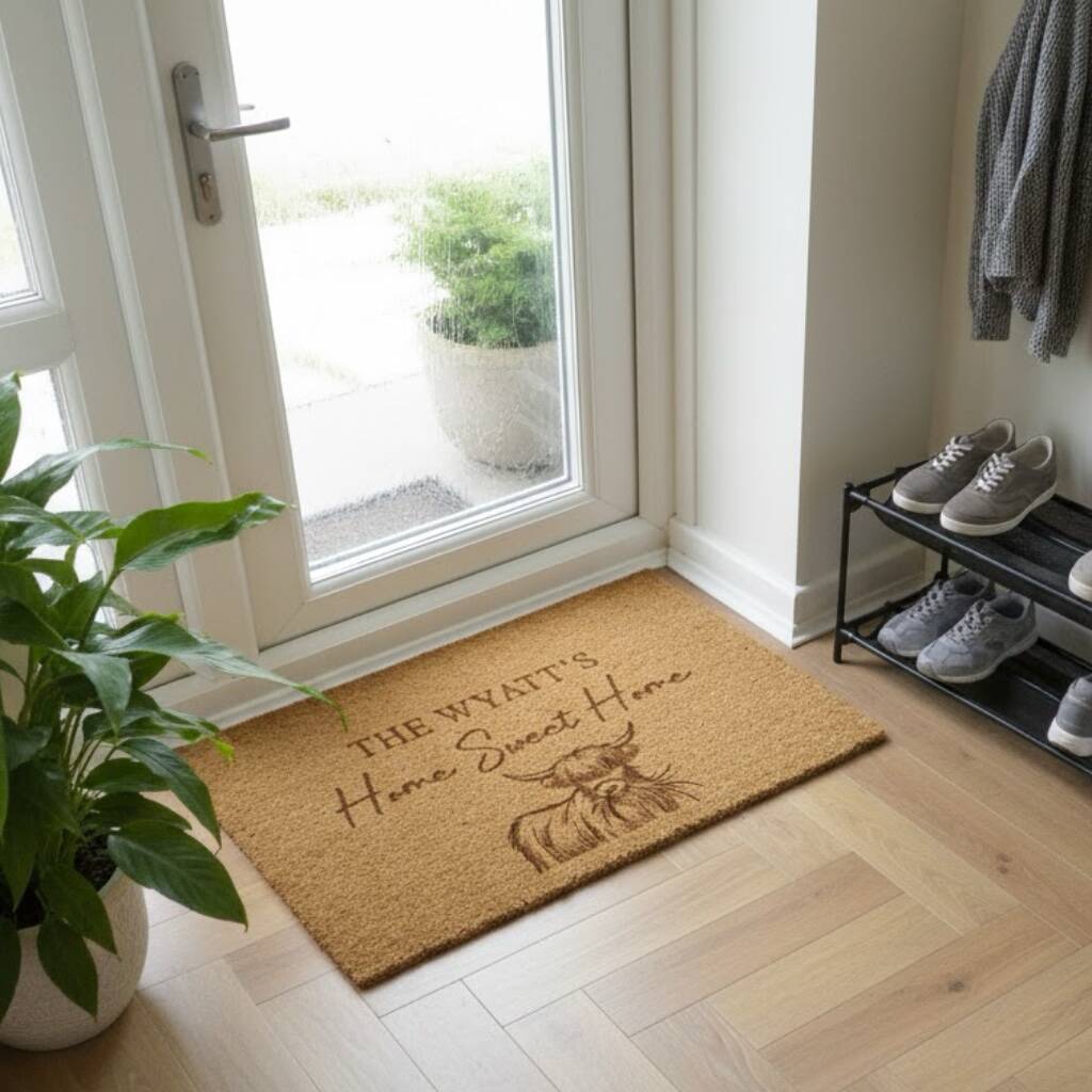 Welcome guests with a touch of Scottish charm and rustic style with our Personalised Highland Cow Coir Doormat.