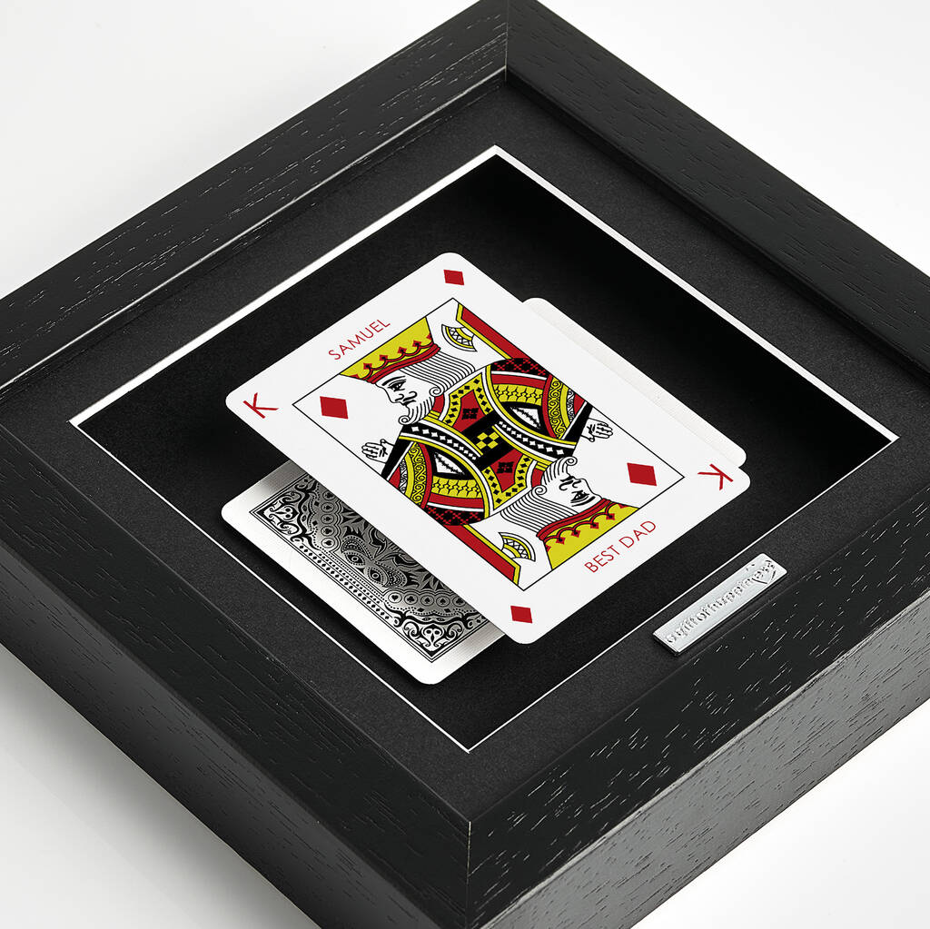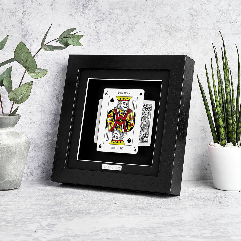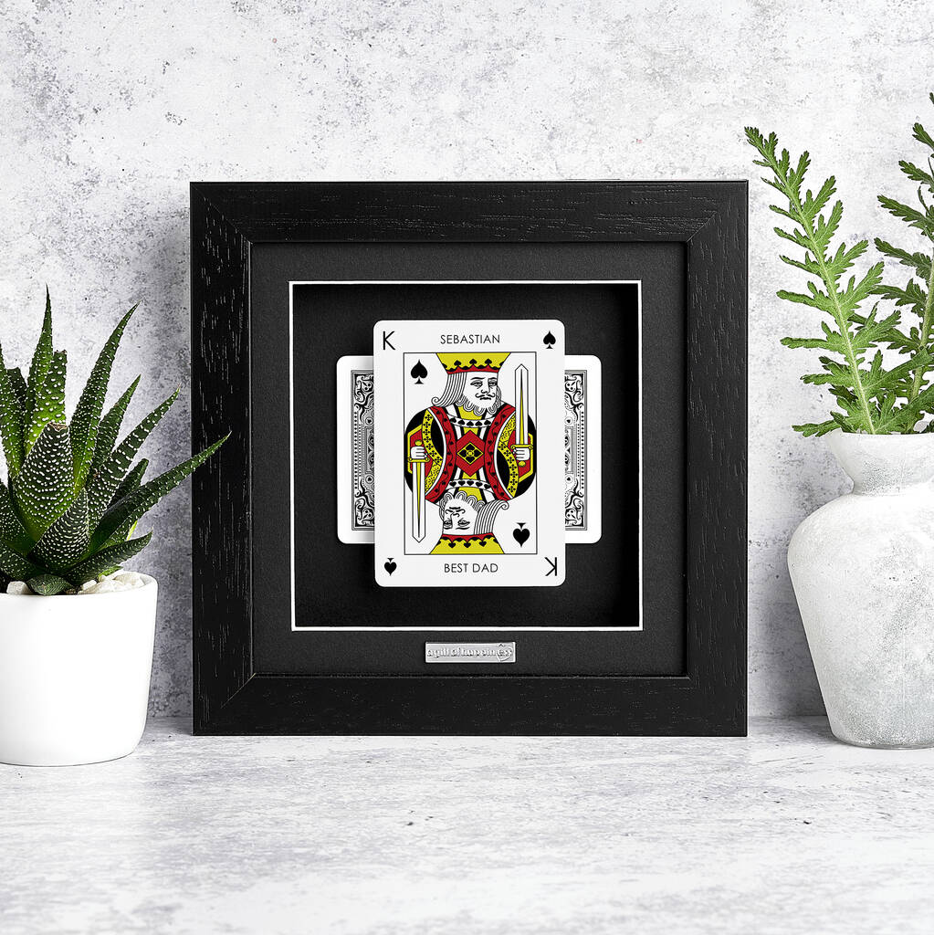 Best Dad, crowned in a frame of distinction, this personalised King playing card gift transforms a timeless symbol into a tribute of love. The iconic King card is reimagined as a personalised print with details chosen by you. Add Dad’s name at the top and a message such as Best Dad, King of the Family, or a phrase of your own underneath. Printed with crisp UV detail onto a genuine playing card, it becomes a striking personalised gift for Dad. Finished in a solid wood frame, it is perfect for Father’s Day, a Christmas gift for Dad, or a birthday gift.
