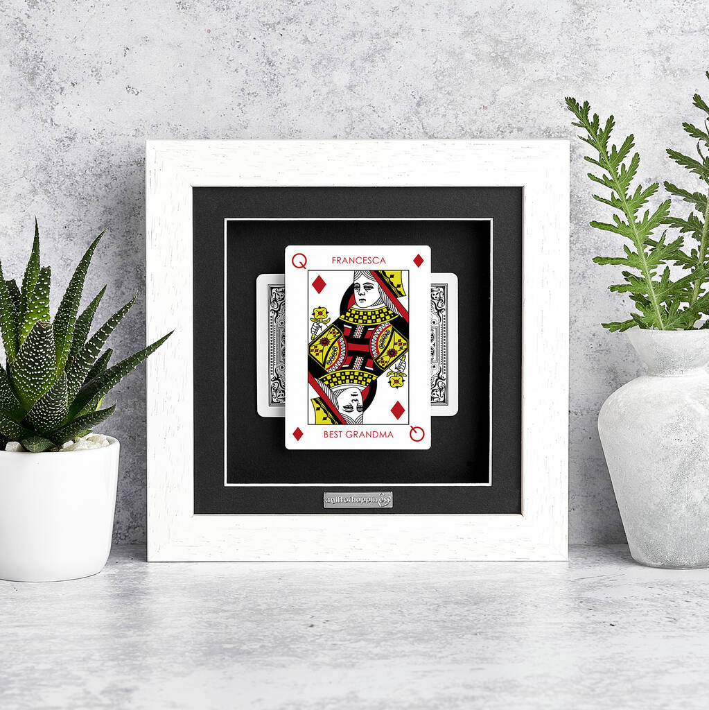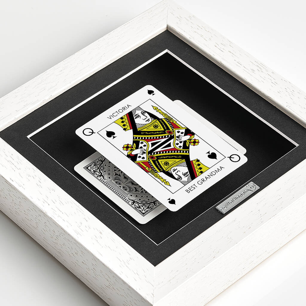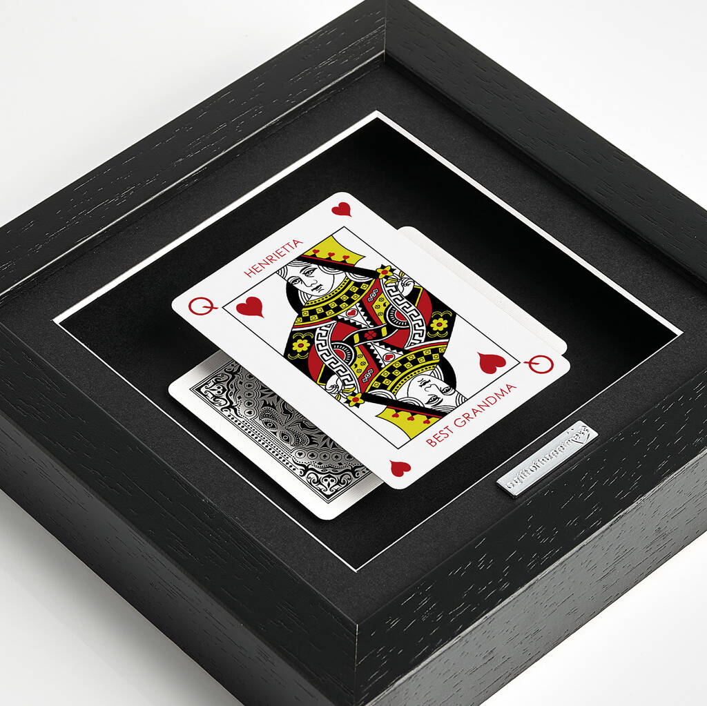•• ORIGINAL DESIGN •• Exclusively created by A Gift of Happiness, this design reimagines the Queen playing card as a tribute to nurturing and family devotion. Balanced within a three-dimensional layout, the card appears to float inside the frame, transforming a familiar icon into an elegant expression of strength and love. More than decoration, it becomes a keepsake Grandma can treasure.