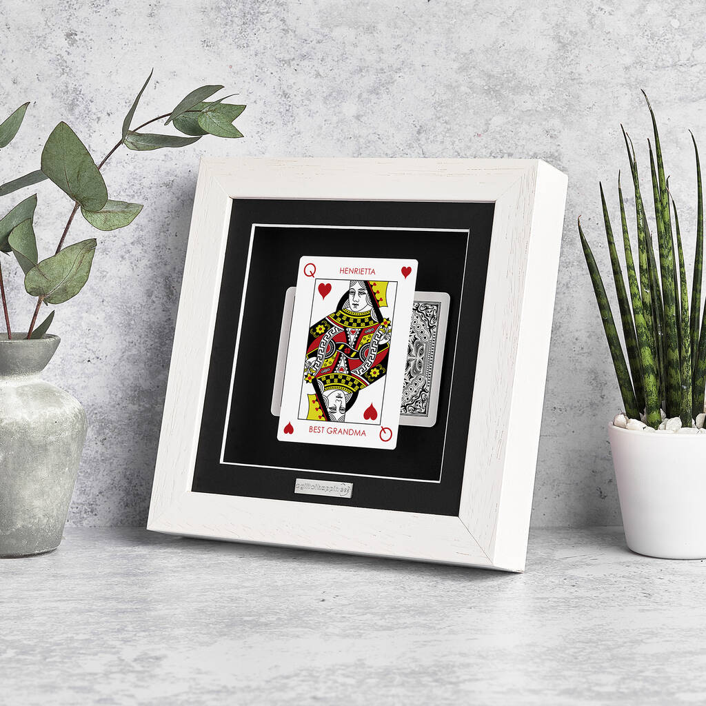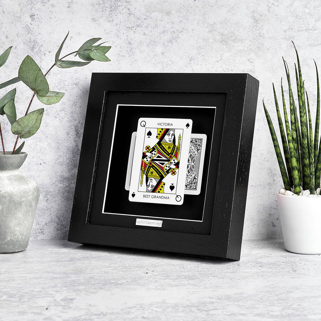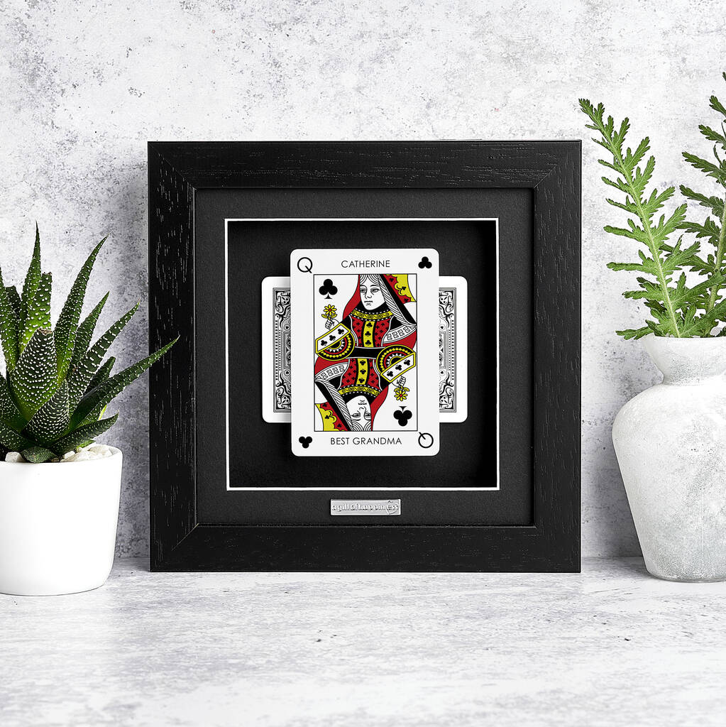 •• ORIGINAL DESIGN •• Exclusively created by A Gift of Happiness, this design reimagines the Queen playing card as a tribute to nurturing and family devotion. Balanced within a three-dimensional layout, the card appears to float inside the frame, transforming a familiar icon into an elegant expression of strength and love. More than decoration, it becomes a keepsake Grandma can treasure.
