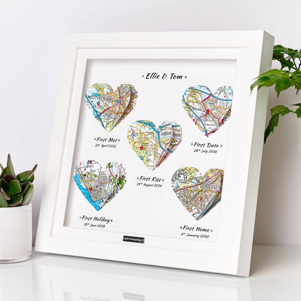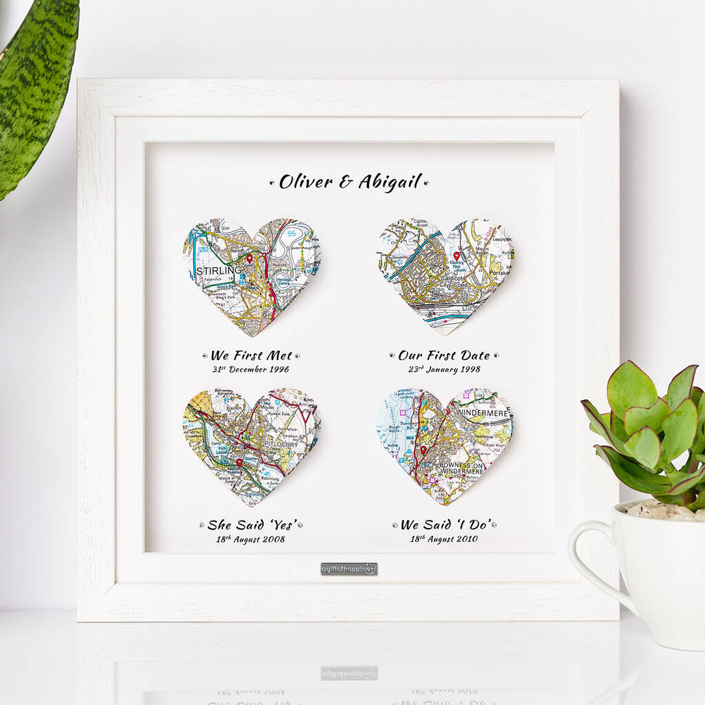 A romantic personalised map print capturing your love story with four milestone locations. A timeless personalised gift, beautifully framed for weddings, anniversaries, or engagements.