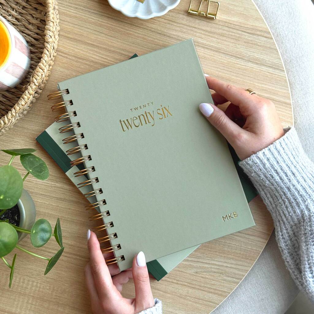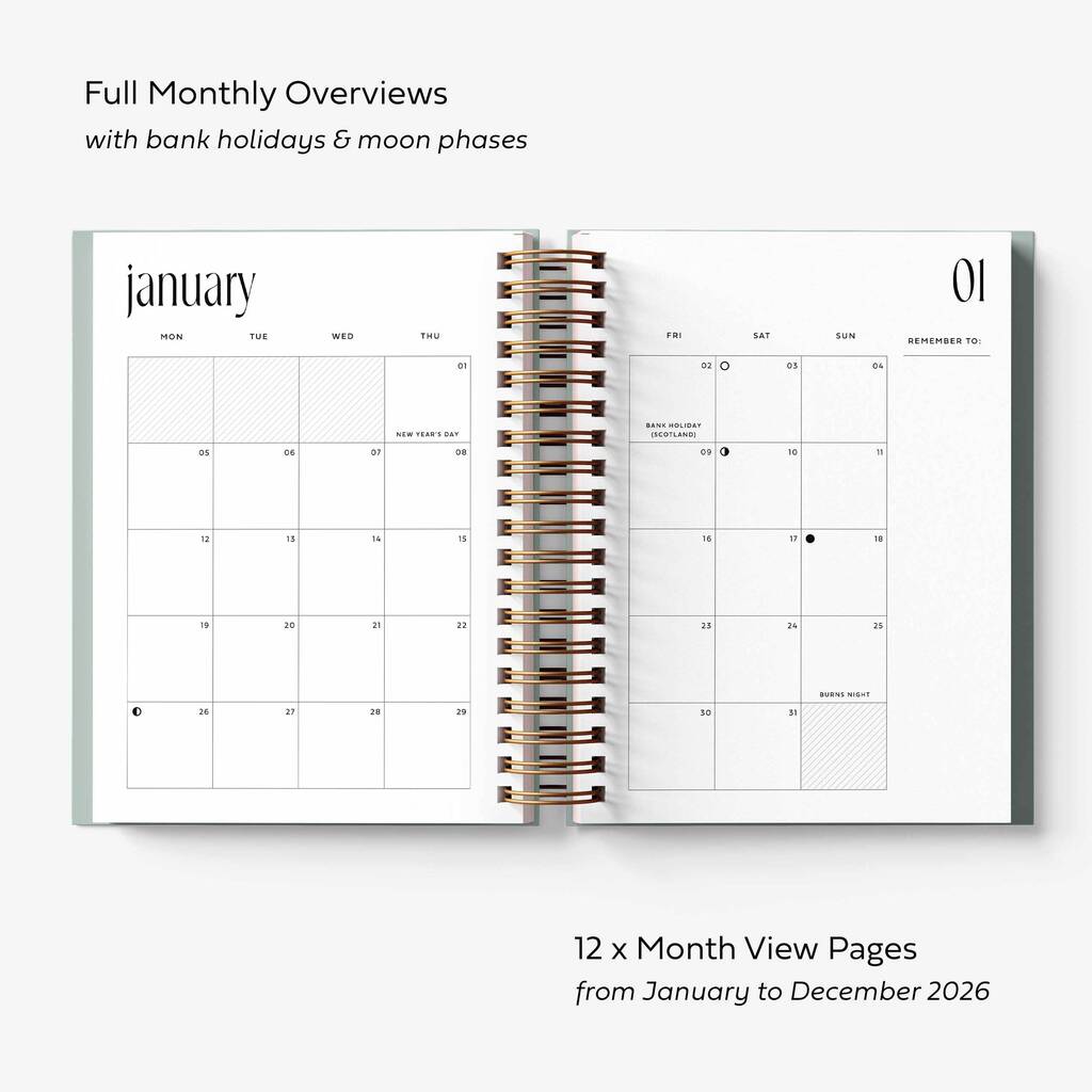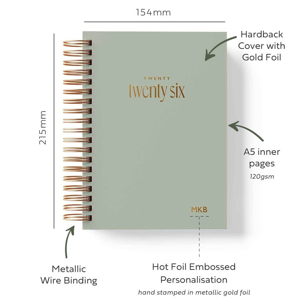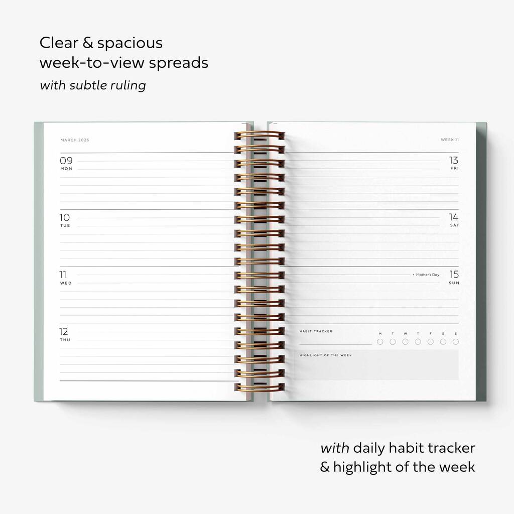 Featuring metallic spiral ring binding, this A5 2026 diary includes a week to view planner format and a stunning sage green hardback cover.