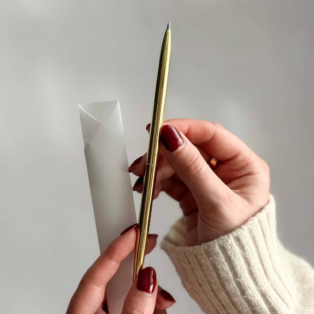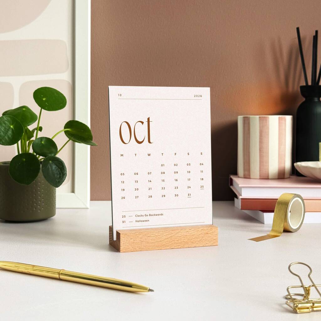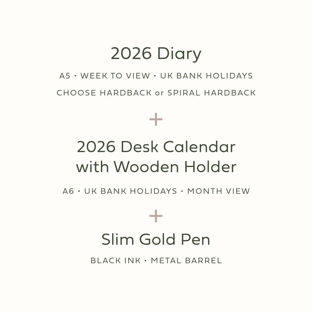 Also included, is our minimal 2026 desk calendar cards with wooden display stand. And finally, a slim gold pen to match your gold foiled diary cover.