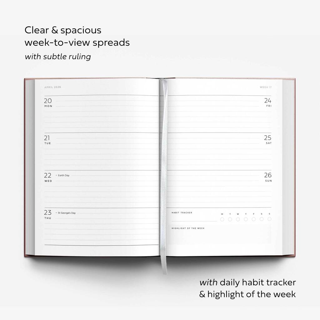 Inside you'll find our personalised 2026 diary, with an option for standard hardback or spiral binding. It has a week to view format with UK bank holidays and a daily habit tracker.