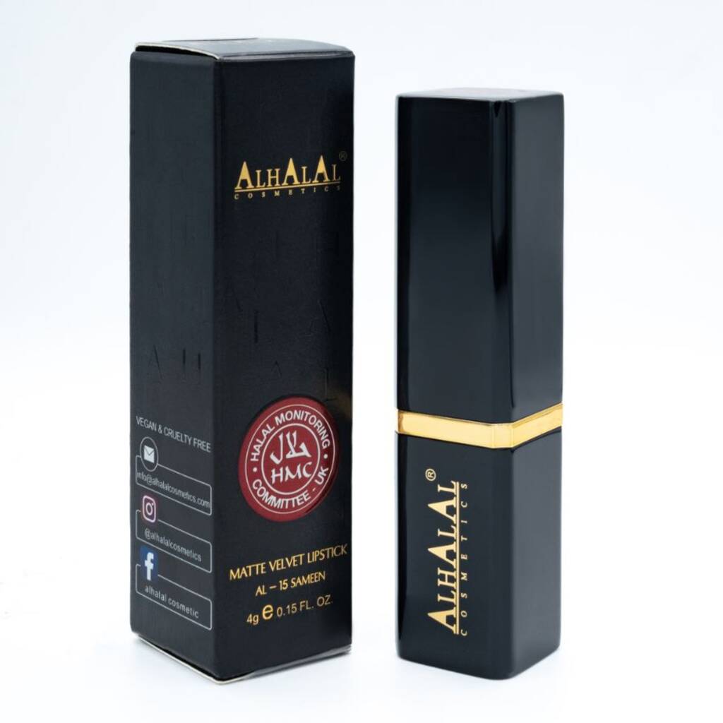 Our AL-15 SAMEEN MATTE VELVET LIPSTICK is certified by the halal monitory committee UK, 100% cruelty free, veganAl Halal Cosmetics specializes in making luxurious cosmetics without the nasty chemicals. With light weight formulas that melt into your lips, you'll never want to put anything on them again. You will love the smoothness.Certified by HALAL monitoring committee united kingdom, Curtly free,light weight formula, Smooth free , Rich Color, Free From Nasty Colors, Clinically Approved Contain Neither Alcohol or Aerosol.It Is A Great Option For Those Who Are Looking For A High-Quality, Halal-Certified, And Cruelty-Free Matte velvet Lipstick.