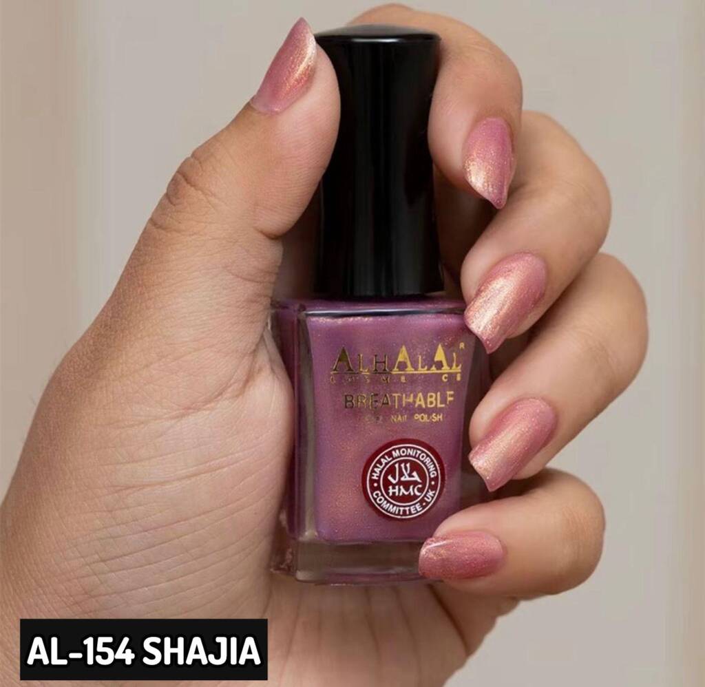 About this item : Our new peel-off nail polish lasts up to 2 days and can be removed in just one easy peel without damaging your nails, Say goodbye to messy soaking, hours of scrubbing, and expensive salon visits Our AL-154 SHAJIA WATER PERMEABLE NAIL POLISH is Water based formulation free of harmful chemicals including formaldehyde, Toluene DBP ,formaldehyde Resin. Camphor , Xylene and Ethyl Toluamide. Our nail polish is not tested on animals! CRUELTY-FREE & VEGAN -- All ALHALAL Cosmetics products are 100% vegan and cruelty-free. We do not believe in testing our products or ingredients on animals. High-impact colour, ultra-shiny finish HALAL AND WUDHU/ABLUTION FRIENDLY -- This product does not contain any animal derivatives or prohibited alcohols. Our nail polishes have been tested and certified as halal and Wudhu friendly. 11-FREE FORMULA -- This nail polish does not contain: formaldehyde, formaldehyde resin, toluene, camphor, DBP, xylene, parabens or many other harsh chemicals. Our products are formulated without the top 11 harshest chemicals found in a typical nail polish BREATHABLE -- formula allows water to permeate through the nail polish, keeping nails healthy and hydrated. Quick drying - Ready to go in under 60 seconds Certified by HALAL monitoring committee united kingdom, Curtly free,light weight formula, Smooth free , Rich Color, Free From Nasty Colors, Clinically Approved Contain Neither Alcohol or Aerosol Makeup Benefits: High Pigmentation, Matte Finish. Halal Ingredients Used: Water, polyurethane-1, sodium dodecylbenzenesulfonate, acrylic acid (ester)/ VA copolymer, slachonium bentonite, calcium gluconate, phenoxyethanol, CI 15850,CI 15880. Al Halal Cosmetics are made of according to Islamic principles and are considered halal, or permissible, for use by Muslims. These cosmetics do not contain any ingredients that are prohibited in Islam, such as alcohol or animal-derived substances, and are produced in accordance with Islamic laws and regulations. 1. They Can Provide The Same High-Quality Performance, Color And Finish As Non-Halal water permeable nail polish. 2. Using Halal Products Can Also Be A Way To Support The Halal Industry And Companies That Align With One'S Personal Values 3. They Are Free Of Ingredients That Are Considered Haram (Forbidden) In Islam Such As Pork Or Alcohol Derivatives. 4. They Do Not Include Animal-Derived Ingredients Or By-Products, Making Them Suitable For Vegans And Vegetarians. 5. They Are Cruelty-Free, Meaning That No Animal Testing Is Performed On The Final Product Or Any Of Its Ingredients. SPECIAL FEATURE : The Halal Certification Process Also Ensures That The Manufacturing Process And The Facility Meet Certain Standards Of Hygiene, Safety And Environmental Protection.