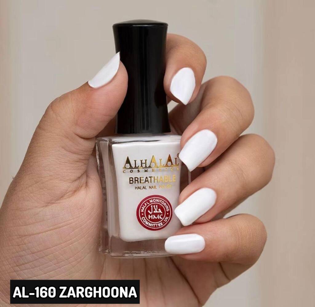 About this item : Our new peel-off nail polish lasts up to 2 days and can be removed in just one easy peel without damaging your nails, Say goodbye to messy soaking, hours of scrubbing, and expensive salon visits Our AL-160 ZARGHOONA WATER PERMEABLE NAIL POLISH is Water based formulation free of harmful chemicals including formaldehyde, Toluene DBP ,formaldehyde Resin. Camphor , Xylene and Ethyl Toluamide. Our nail polish is not tested on animals! CRUELTY-FREE & VEGAN -- All ALHALAL Cosmetics products are 100% vegan and cruelty-free. We do not believe in testing our products or ingredients on animals. High-impact colour, ultra-shiny finish HALAL AND WUDHU/ABLUTION FRIENDLY -- This product does not contain any animal derivatives or prohibited alcohols. Our nail polishes have been tested and certified as halal and Wudhu friendly. 11-FREE FORMULA -- This nail polish does not contain: formaldehyde, formaldehyde resin, toluene, camphor, DBP, xylene, parabens or many other harsh chemicals. Our products are formulated without the top 11 harshest chemicals found in a typical nail polish BREATHABLE -- formula allows water to permeate through the nail polish, keeping nails healthy and hydrated. Quick drying - Ready to go in under 60 seconds Certified by HALAL monitoring committee united kingdom, Curtly free,light weight formula, Smooth free , Rich Color, Free From Nasty Colors, Clinically Approved Contain Neither Alcohol or Aerosol Makeup Benefits: High Pigmentation, Matte Finish. Halal Ingredients Used: Water, polyurethane-1, sodium dodecylbenzenesulfonate, acrylic acid (ester)/ VA copolymer, slachonium bentonite, calcium gluconate, phenoxyethanol, CI 15850,CI 15880. Al Halal Cosmetics are made of according to Islamic principles and are considered halal, or permissible, for use by Muslims. These cosmetics do not contain any ingredients that are prohibited in Islam, such as alcohol or animal-derived substances, and are produced in accordance with Islamic laws and regulations. 1. They Can Provide The Same High-Quality Performance, Color And Finish As Non-Halal water permeable nail polish. 2. Using Halal Products Can Also Be A Way To Support The Halal Industry And Companies That Align With One'S Personal Values 3. They Are Free Of Ingredients That Are Considered Haram (Forbidden) In Islam Such As Pork Or Alcohol Derivatives. 4. They Do Not Include Animal-Derived Ingredients Or By-Products, Making Them Suitable For Vegans And Vegetarians. 5. They Are Cruelty-Free, Meaning That No Animal Testing Is Performed On The Final Product Or Any Of Its Ingredients. SPECIAL FEATURE : The Halal Certification Process Also Ensures That The Manufacturing Process And The Facility Meet Certain Standards Of Hygiene, Safety And Environmental Protection.