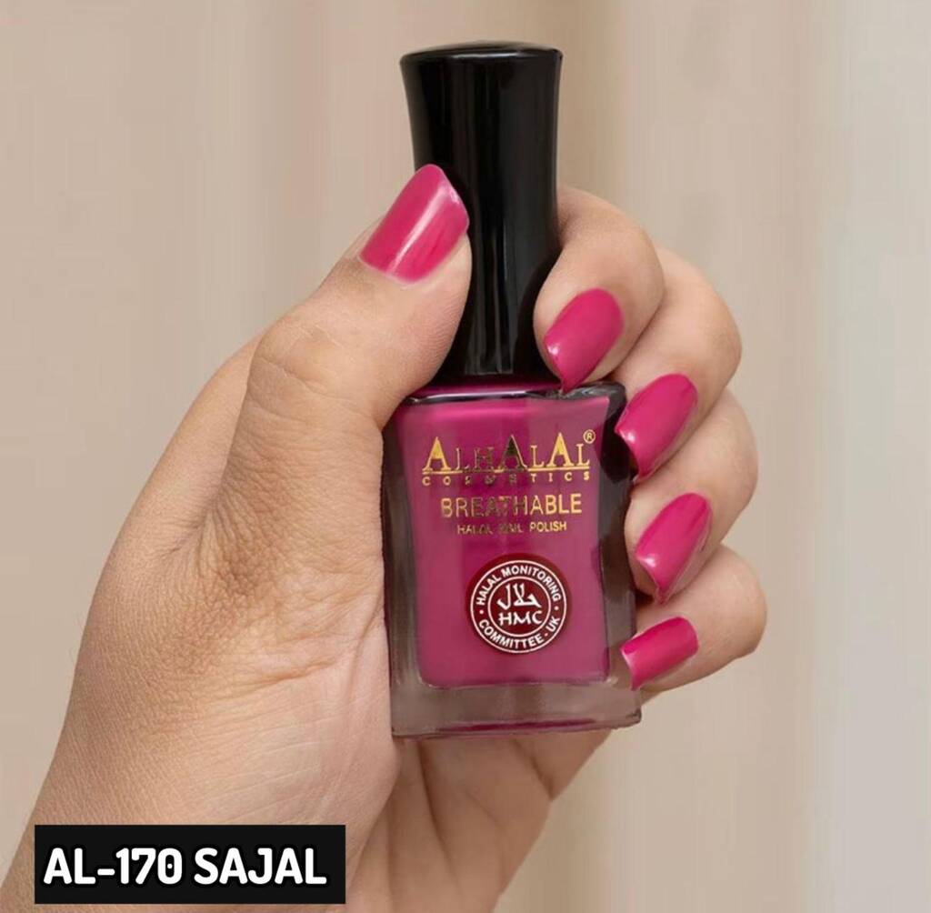 About this item : Our new peel-off nail polish lasts up to 2 days and can be removed in just one easy peel without damaging your nails, Say goodbye to messy soaking, hours of scrubbing, and expensive salon visits Our AL-170 SAJAL WATER PERMEABLE NAIL POLISH is Water based formulation free of harmful chemicals including formaldehyde, Toluene DBP ,formaldehyde Resin. Camphor , Xylene and Ethyl Toluamide. Our nail polish is not tested on animals! CRUELTY-FREE & VEGAN -- All ALHALAL Cosmetics products are 100% vegan and cruelty-free. We do not believe in testing our products or ingredients on animals. High-impact colour, ultra-shiny finish HALAL AND WUDHU/ABLUTION FRIENDLY -- This product does not contain any animal derivatives or prohibited alcohols. Our nail polishes have been tested and certified as halal and Wudhu friendly. 11-FREE FORMULA -- This nail polish does not contain: formaldehyde, formaldehyde resin, toluene, camphor, DBP, xylene, parabens or many other harsh chemicals. Our products are formulated without the top 11 harshest chemicals found in a typical nail polish BREATHABLE -- formula allows water to permeate through the nail polish, keeping nails healthy and hydrated. Quick drying - Ready to go in under 60 seconds Certified by HALAL monitoring committee united kingdom, Curtly free,light weight formula, Smooth free , Rich Color, Free From Nasty Colors, Clinically Approved Contain Neither Alcohol or Aerosol Makeup Benefits: High Pigmentation, Matte Finish. Halal Ingredients Used: Water, polyurethane-1, sodium dodecylbenzenesulfonate, acrylic acid (ester)/ VA copolymer, slachonium bentonite, calcium gluconate, phenoxyethanol, CI 15850,CI 15880. Al Halal Cosmetics are made of according to Islamic principles and are considered halal, or permissible, for use by Muslims. These cosmetics do not contain any ingredients that are prohibited in Islam, such as alcohol or animal-derived substances, and are produced in accordance with Islamic laws and regulations. 1. They Can Provide The Same High-Quality Performance, Color And Finish As Non-Halal water permeable nail polish. 2. Using Halal Products Can Also Be A Way To Support The Halal Industry And Companies That Align With One'S Personal Values 3. They Are Free Of Ingredients That Are Considered Haram (Forbidden) In Islam Such As Pork Or Alcohol Derivatives. 4. They Do Not Include Animal-Derived Ingredients Or By-Products, Making Them Suitable For Vegans And Vegetarians. 5. They Are Cruelty-Free, Meaning That No Animal Testing Is Performed On The Final Product Or Any Of Its Ingredients. SPECIAL FEATURE : The Halal Certification Process Also Ensures That The Manufacturing Process And The Facility Meet Certain Standards Of Hygiene, Safety And Environmental Protection.