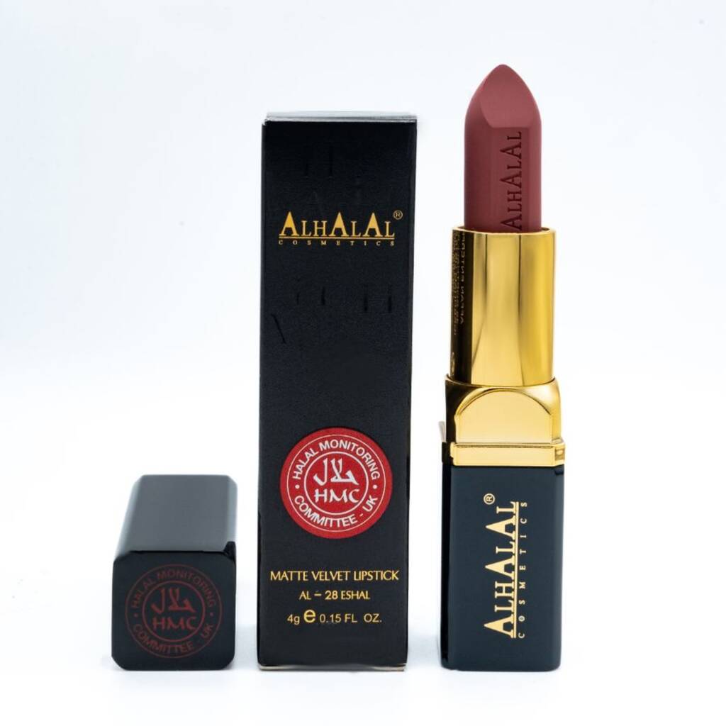 Our AL-28 ESHAL MATTE VELVET LIPSTICK is certified by the halal monitory committee UK, 100% cruelty free, veganAl Halal Cosmetics specializes in making luxurious cosmetics without the nasty chemicals. With light weight formulas that melt into your lips, you'll never want to put anything on them again. You will love the smoothness.Certified by HALAL monitoring committee united kingdom, Curtly free,light weight formula, Smooth free , Rich Color, Free From Nasty Colors, Clinically Approved Contain Neither Alcohol or Aerosol.It Is A Great Option For Those Who Are Looking For A High-Quality, Halal-Certified, And Cruelty-Free Matte velvet Lipstick.