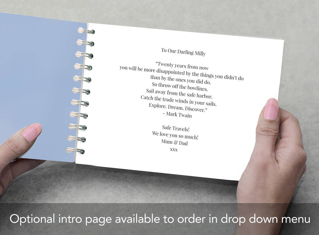 A personalised world travel scrapbook which can be used for writing in as well as sticking in photos and other momentos from your trip.