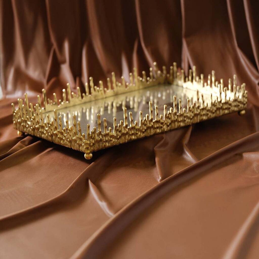 Gold-plated brass tray with mirrored base and striking skyline-inspired edge.Handcrafted from gold-plated brass, the Dory Tray blends sculptural elegance with functional design. Its mirrored glass base reflects light beautifully, framed by an intricate border of vertically cast rods reminiscent of a city skyline or rising flames. Elevated on small rounded feet, it adds height and drama to your décor. Perfect for serving in style or as a statement centrepiece, this tray transforms any table or console into a display of luxury and artistry.