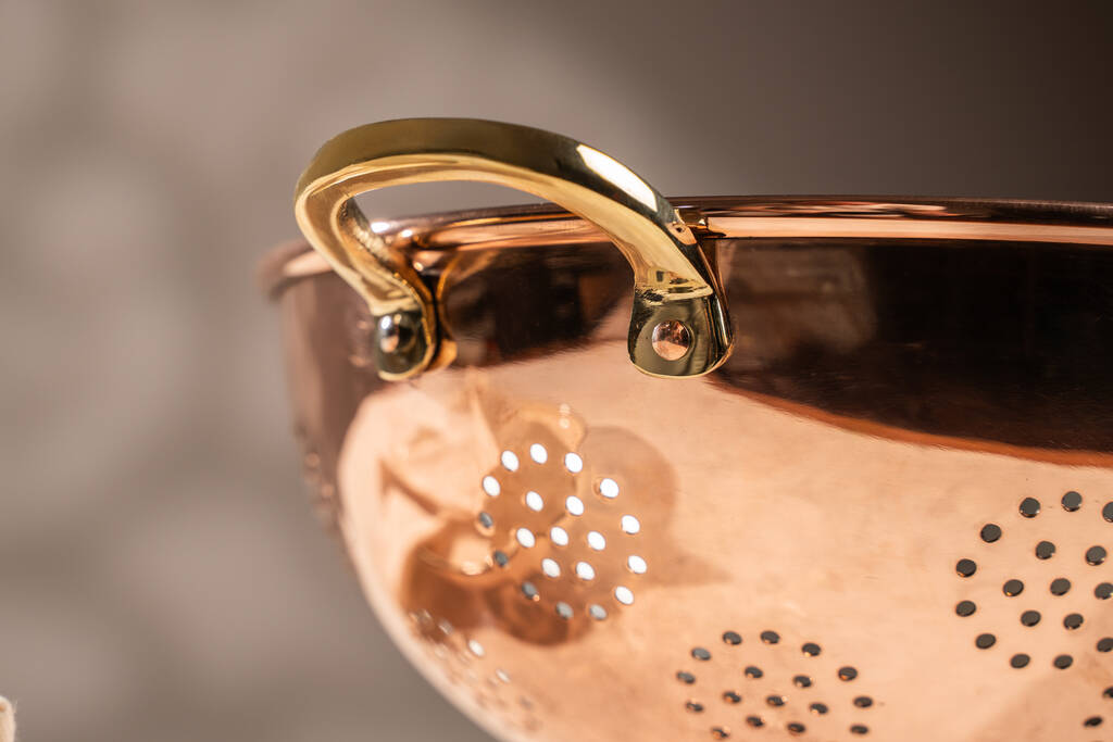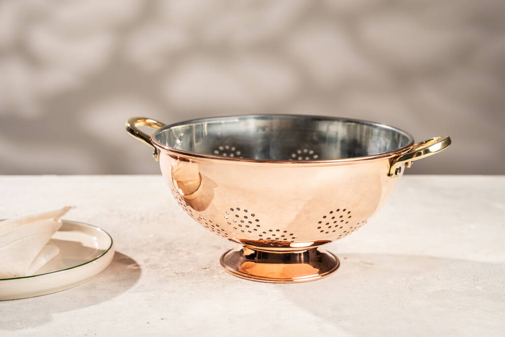Handcrafted copper colander with tin-lined interior and brass handles – a kitchen essential with vintage eleganceTimeless and versatile the Polished Copper Colander with Tin Interior brings artisanal sophistication to everyday kitchen tasks. Handcrafted from solid copper and finished with a radiant mirror polish it features a food-safe tin lining and contrasting brass handles for style and stability. A gently flared base keeps it steady during use while the perforated design allows for fast and efficient draining. Perfect for rinsing fruits draining pasta or simply displaying on an open shelf it adds warmth and heritage charm to any kitchen