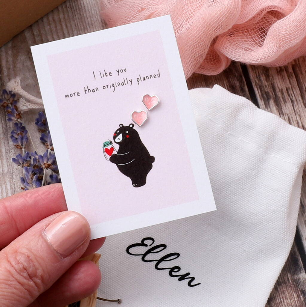 An adorable pair of sterling silver origami style heart earrings presented on a cute presentation card. The message on the card reads: 'I like you more than originally planned"