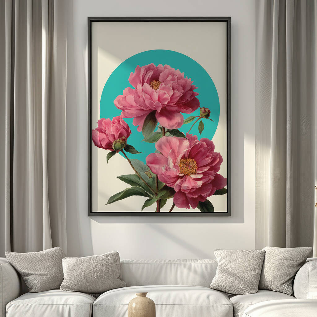 A vibrant pink peony artwork blending classic botanical detail with a modern teal backdrop, adding colour, softness, and natural warmth to living spaces and corners.