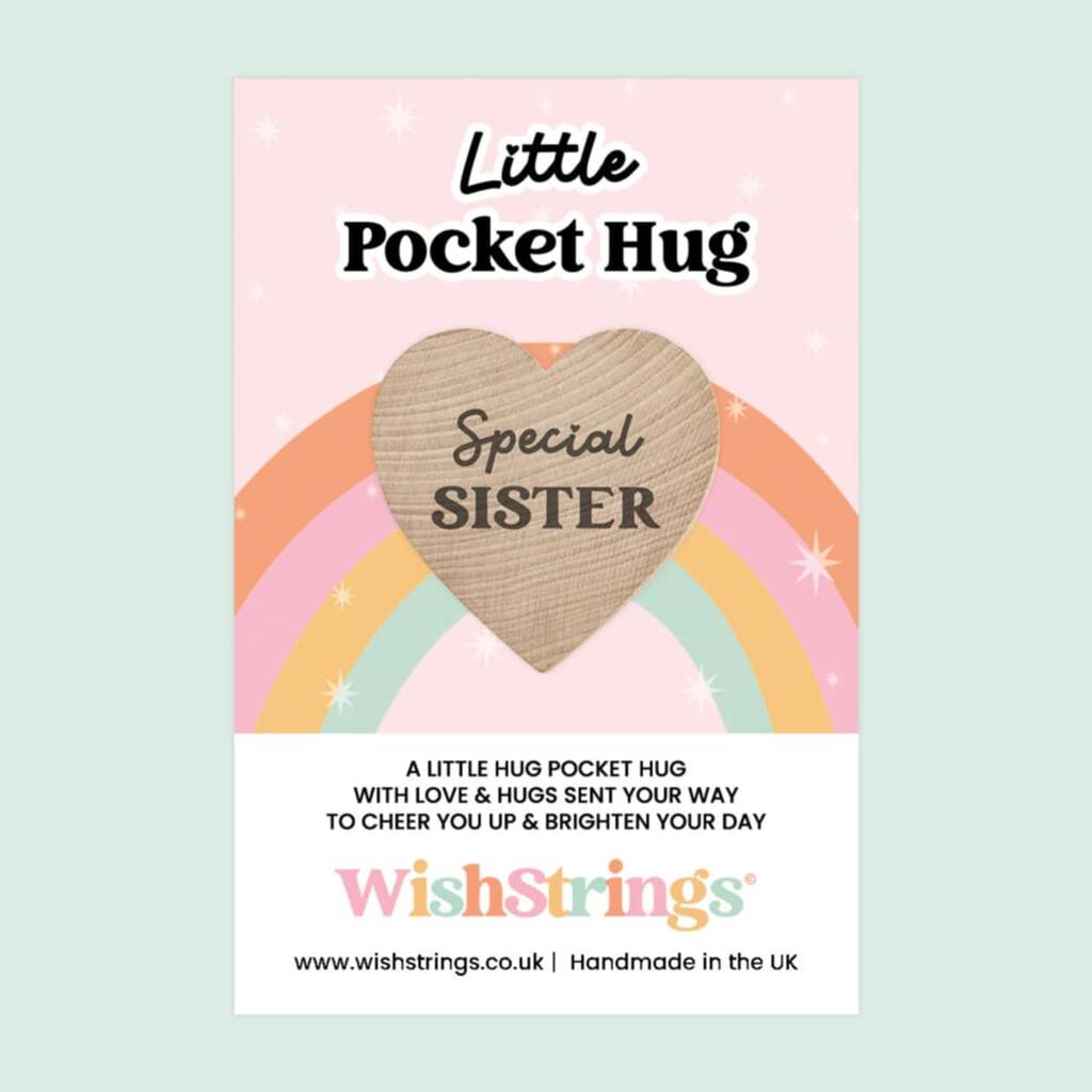 - Special Sister - little pocket hug. Oak veneer wooden heart token, laser engraved and mounted on a themed card, crafted in the UK.