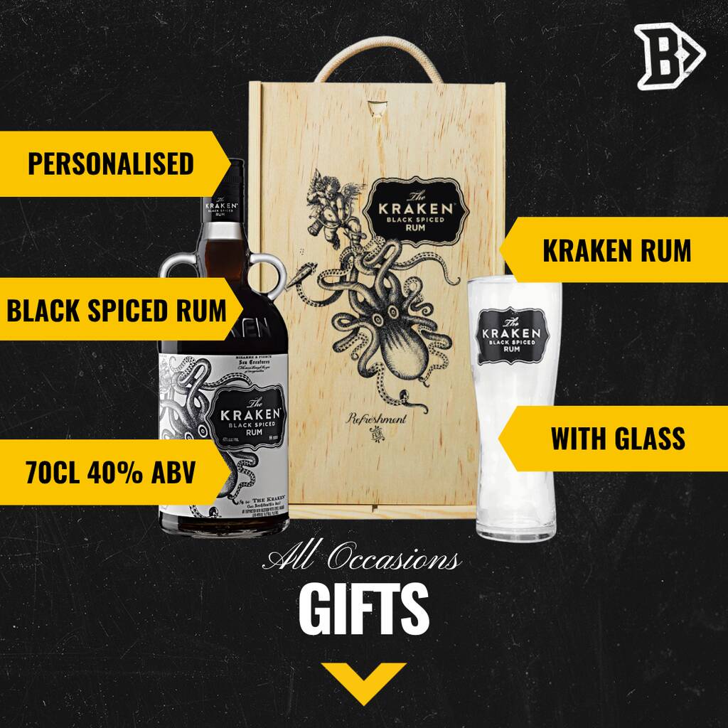 Personalised Kraken Black Spiced Rum Gift Box With Kraken Glass