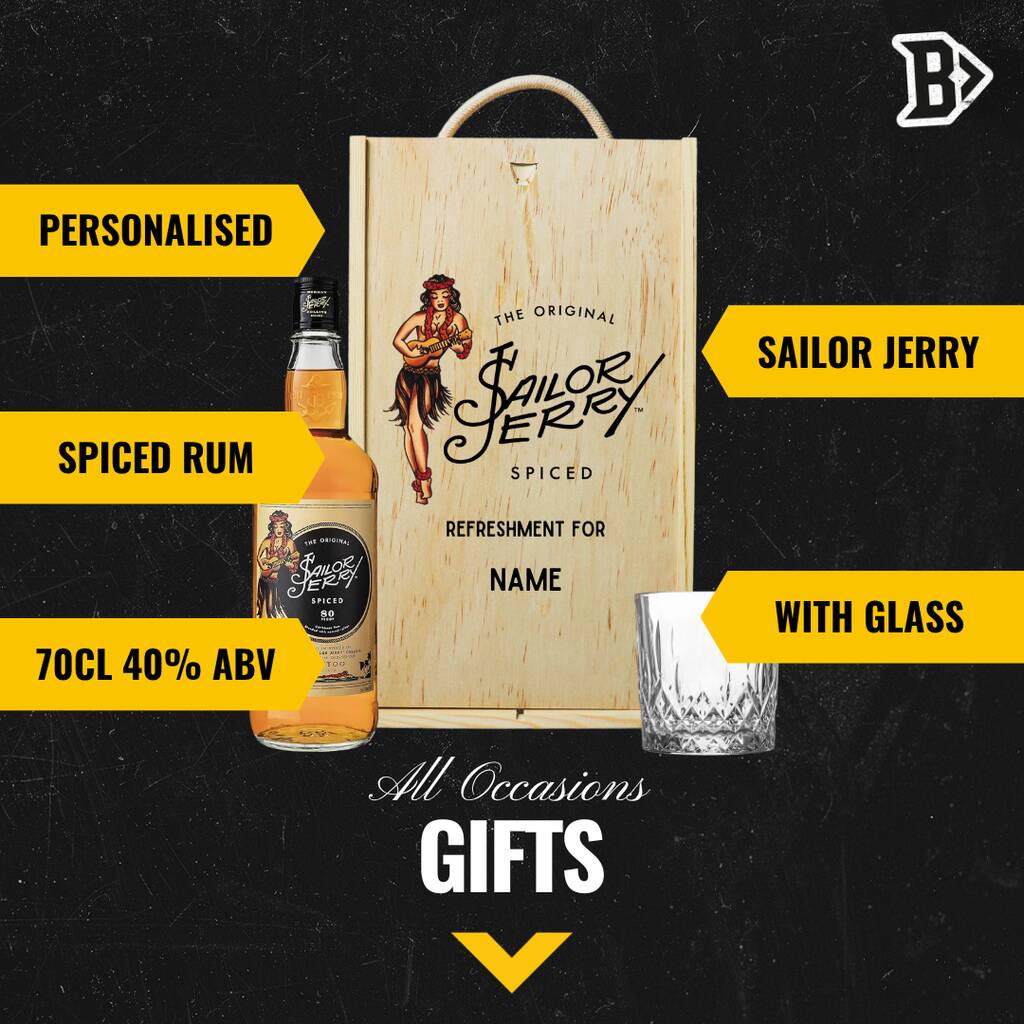 This Personalised Sailor Jerry Original Rum Gift Set features a bottle of Sailor Jerry Spiced Rum in a decorative, personalised keepsake wooden gift box.