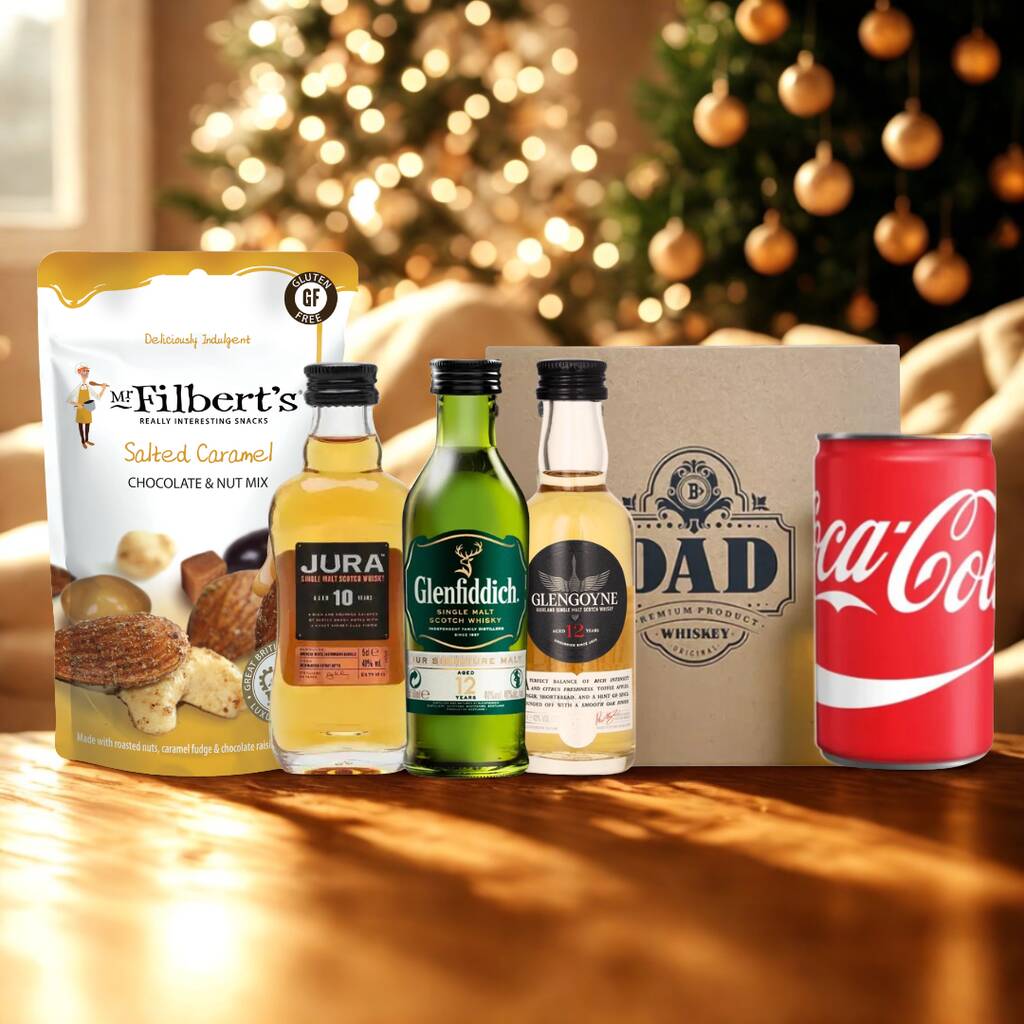 Treat Dad to a luxury whisky gift set that celebrates craftsmanship and flavour. This Single Malt Whiskies Dad Gift Set includes three 50ml miniatures — Jura 10 Year Old, Glengoyne 12 Year Old, and Glenfiddich 12 Year Old — perfectly paired with Mr Filbert’s Salted Caramel Nuts & Chocolate and a 150ml can of Coca-Cola.
