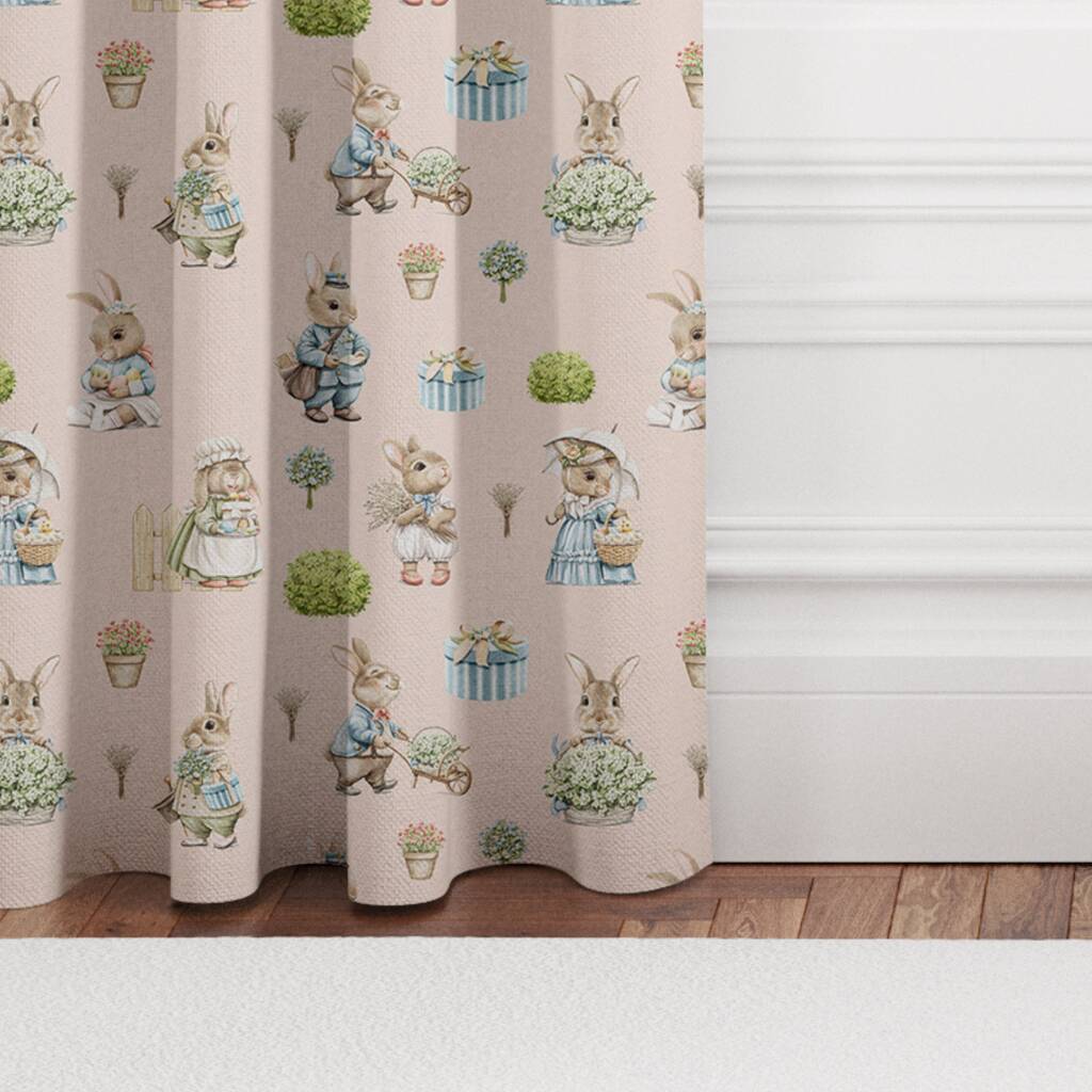 Blackout lined children's bedroom and nursery curtains featuring the cutest family of bunny rabbits, keeping busy in the sunshine, gardening, baking and posting letters!