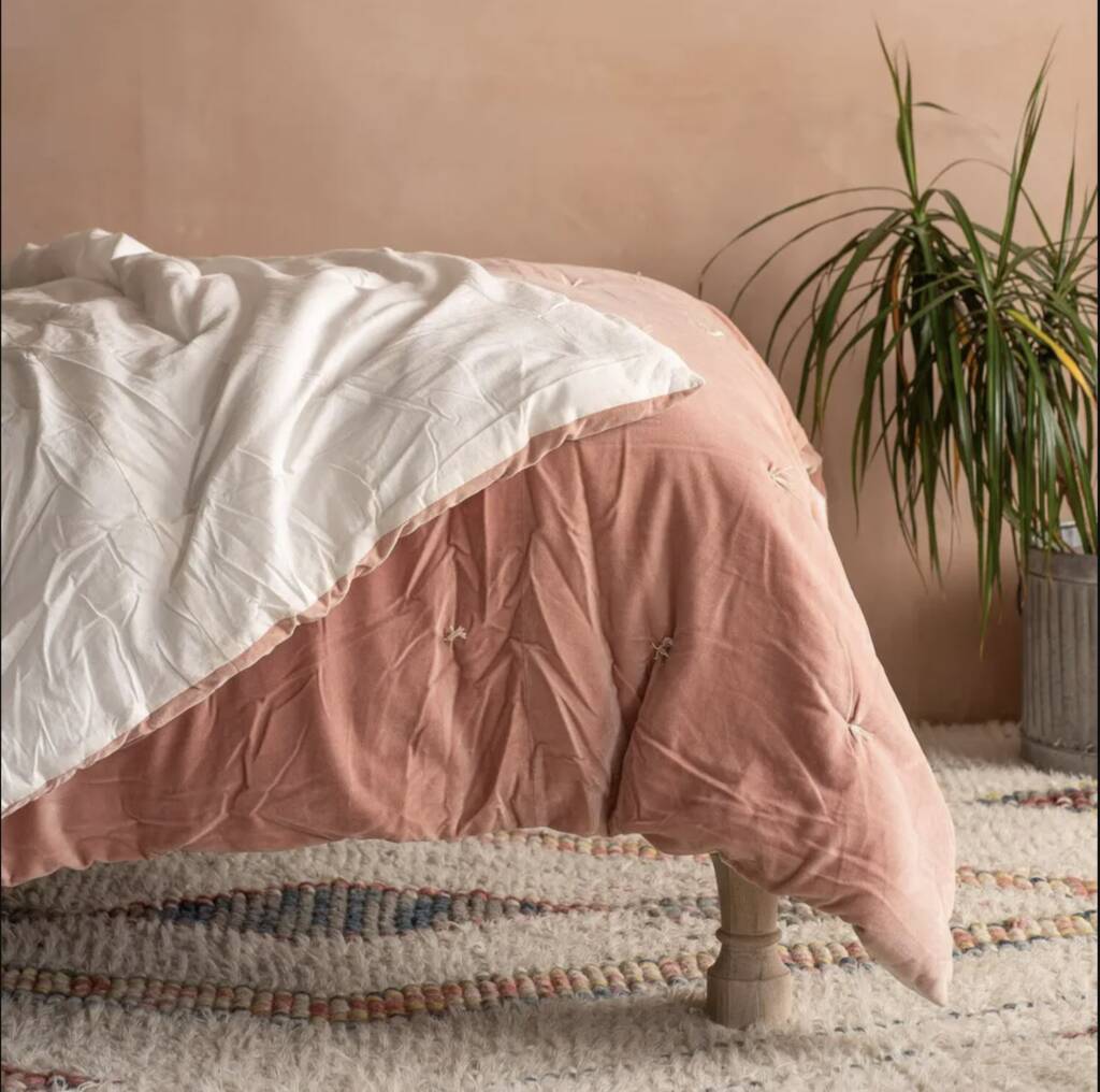 Transform your bedroom into a haven of luxury with our velvet pebble quilts. Crafted with the finest attention to detail, each quilt features a front made from rose pink cotton velvet, offering an irresistibly soft and plush feel. The hand-knotted tassel detailing adds a touch of elegance, while the ivory cotton voile backing ensures a gentle, breathable finish for a comfortable night's sleep.