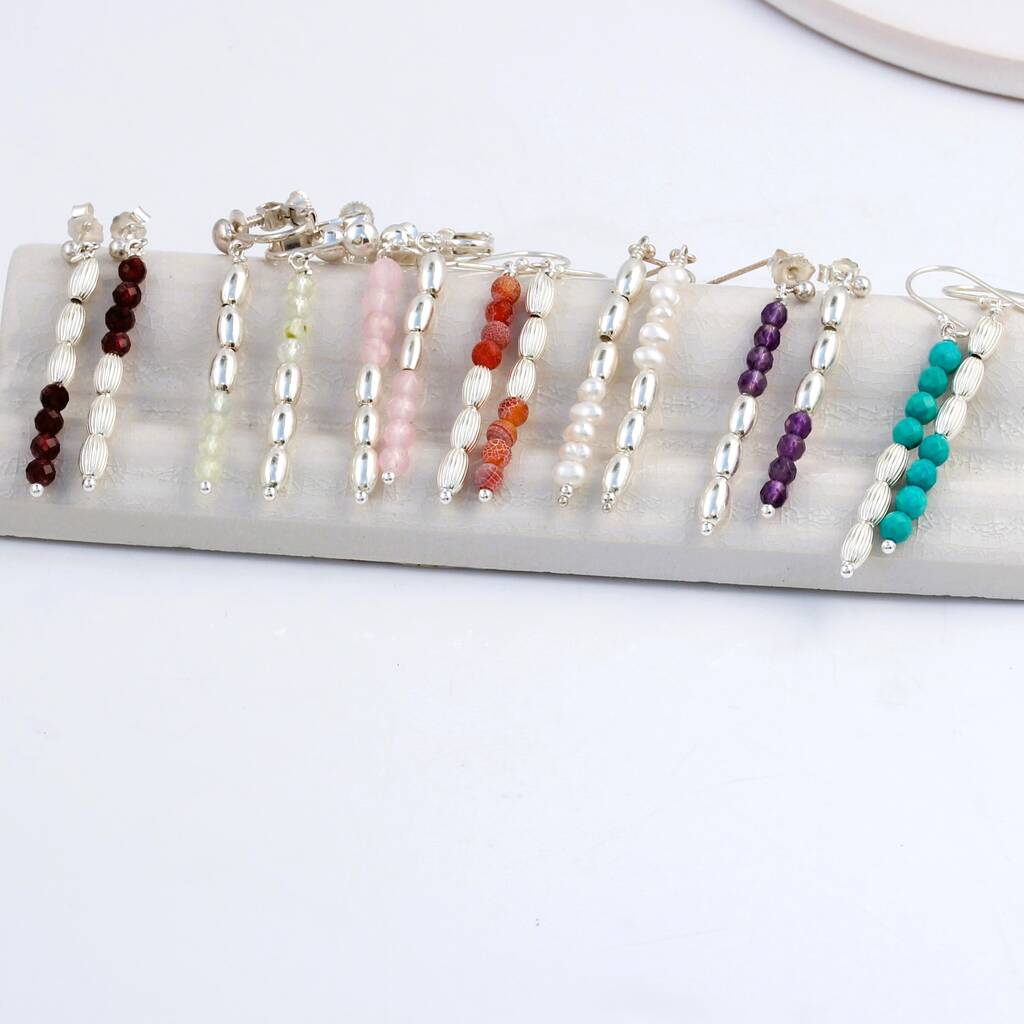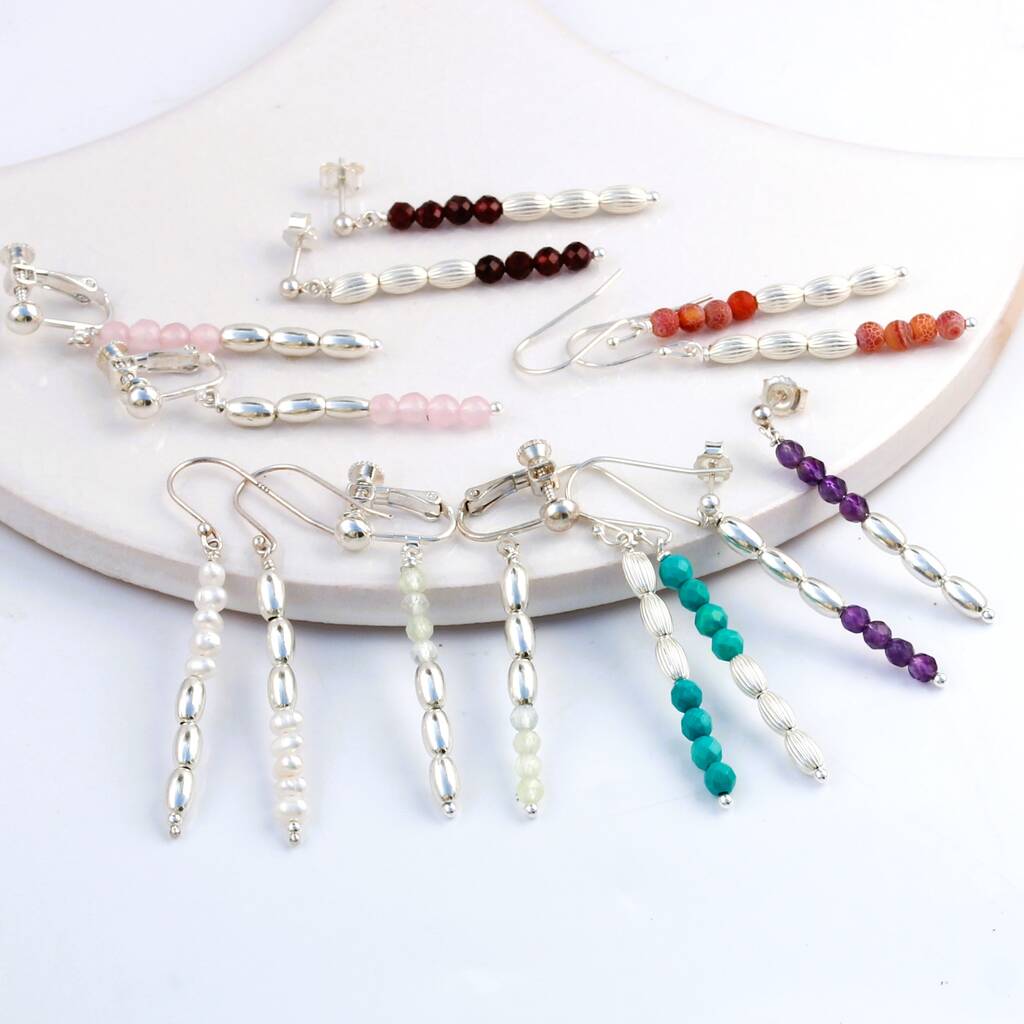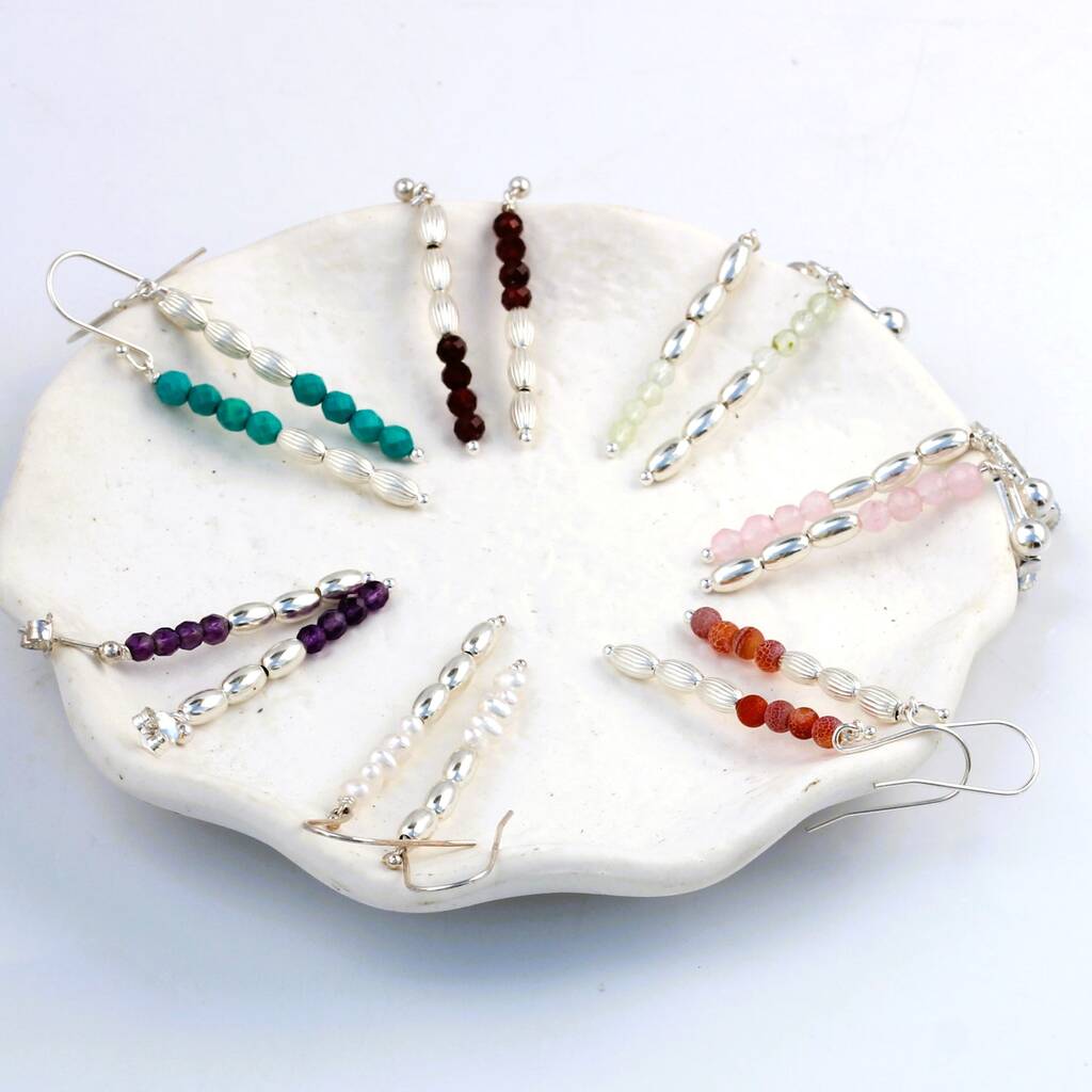 Add chic style with Bish Bosh Becca's handmade mismatched gemstone drop earrings wth sterling silver. The perfect thoughtful jewellery gift for her birthday or Christmas