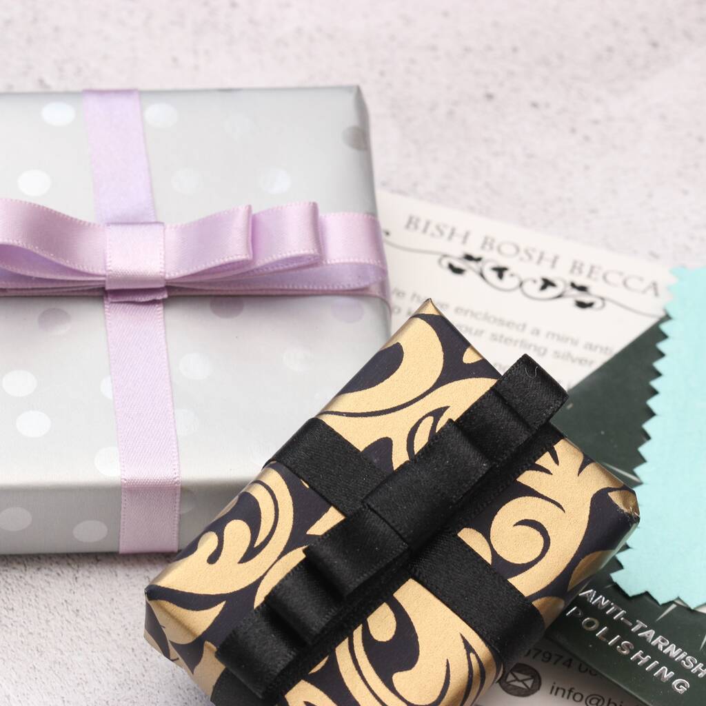 Our mismatched earrings will be gift wrapped in a black branded Bish Bosh Becca box, tied in ivory ribbon and a gift card attached. This standard gift wrap is free of charge. For a small charge, you can choose luxury gift wrap, either silver and lilac, or gold and blac