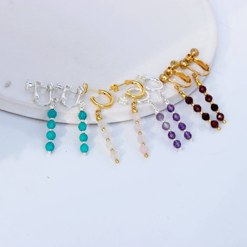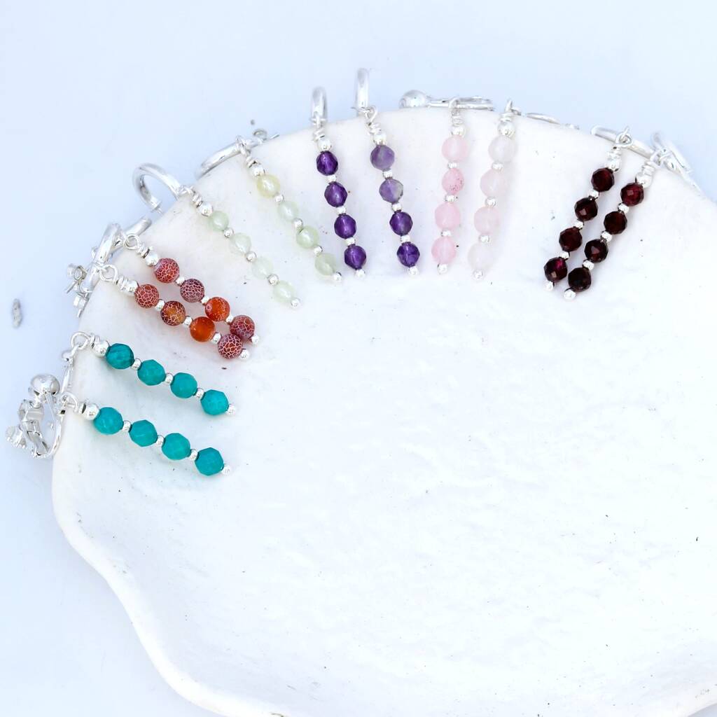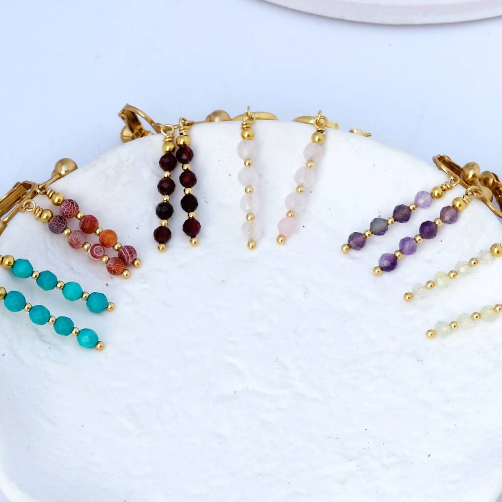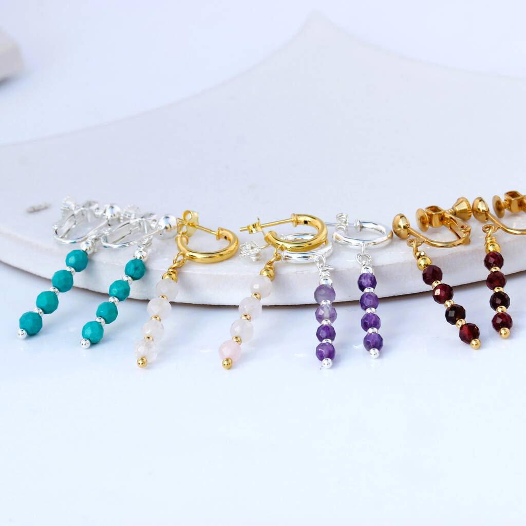 Our gemstone drop hoop earrings are available on sterling silver or gold vermeil hoops as well as silver or gold plated clip ons for unpierced ears. Choose from the following vibrant shades and soft gentle colours.