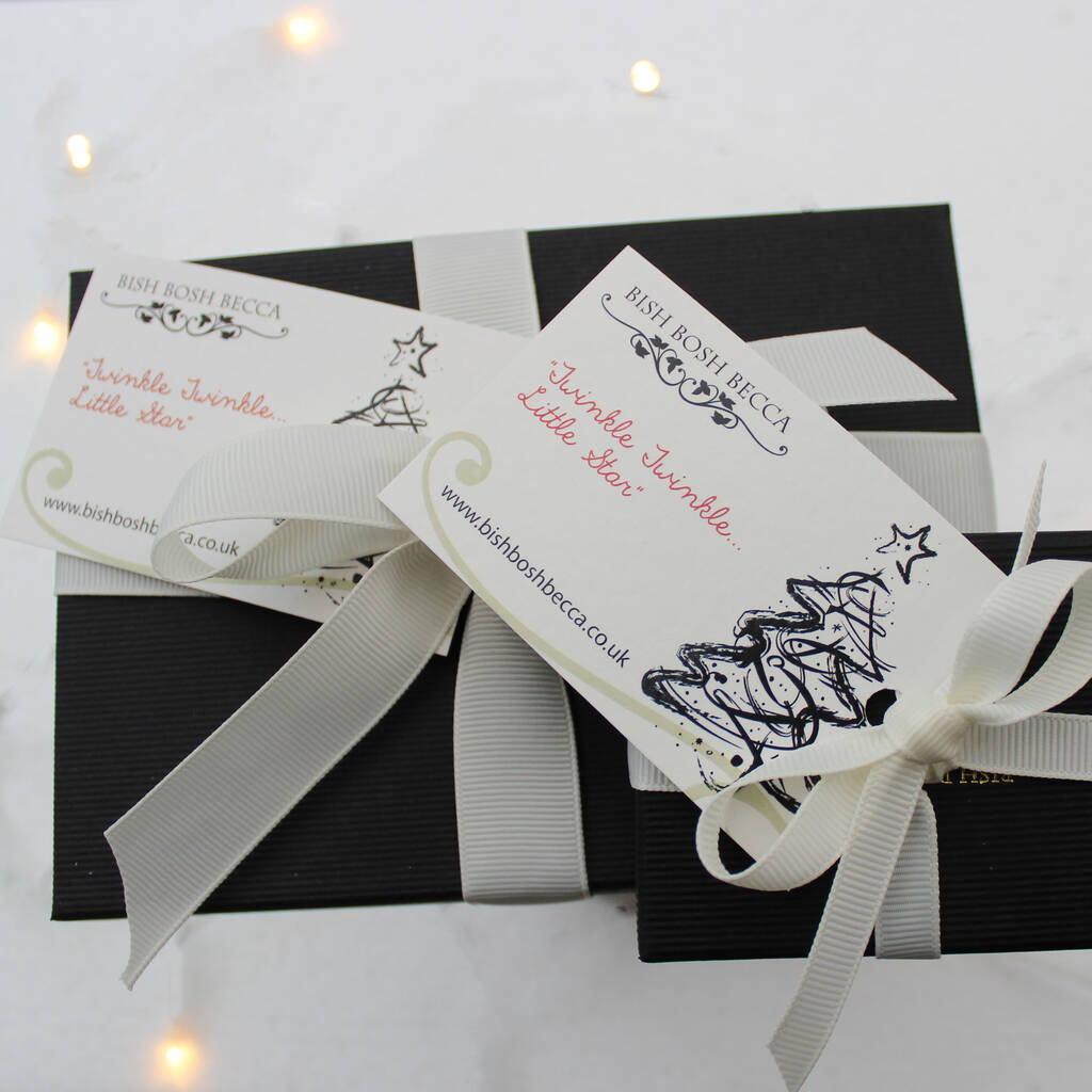 Our gemstone earrings will be gift wrapped in a black branded Bish Bosh Becca box, tied in ivory ribbon and a gift card attached. This standard gift wrap is free of charge. For a small charge, you can choose luxury gift wrap, either silver and lilac, or gold and blac
