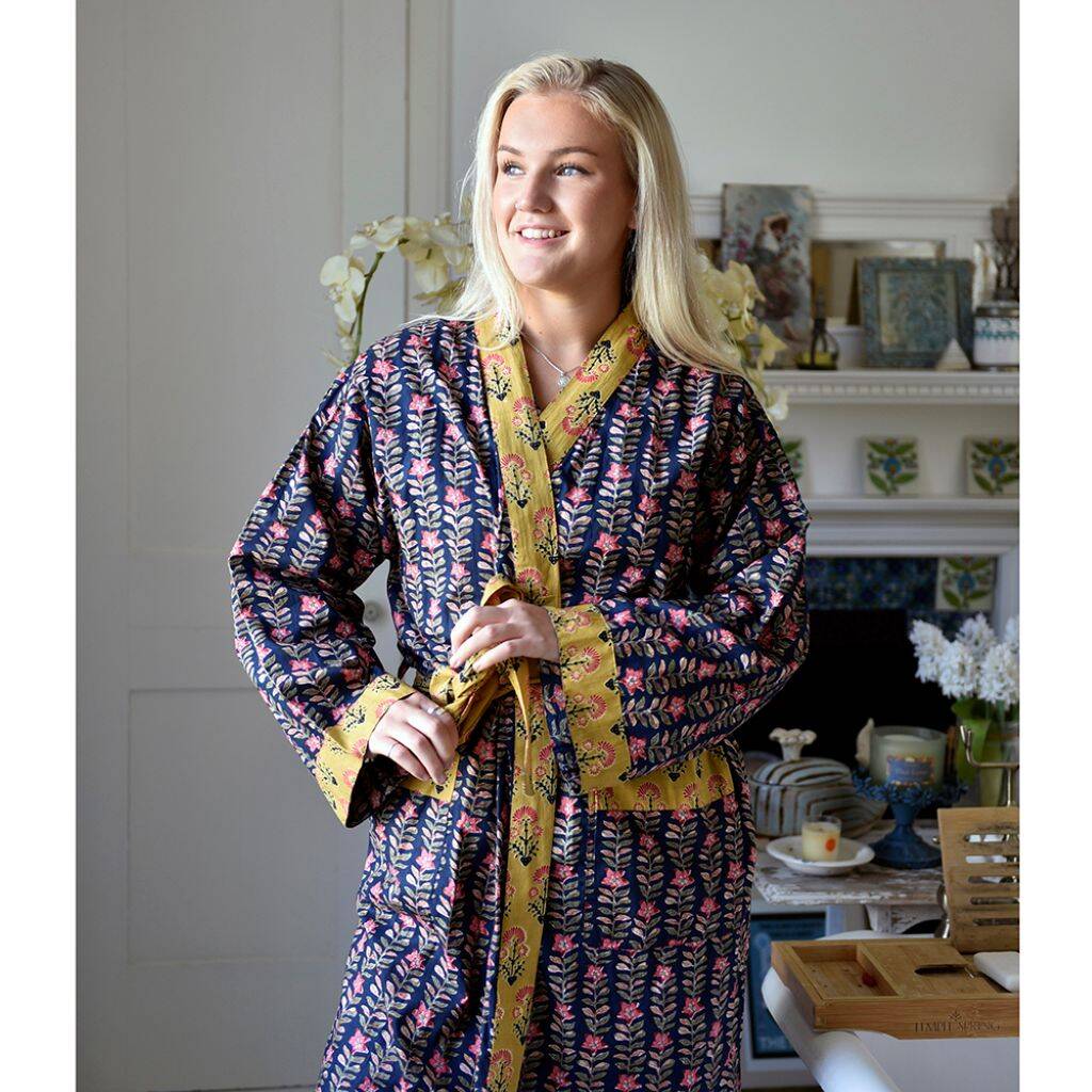 Block Printed Navy Blue, Mustard And Pink Lily Cotton Dressing Gown