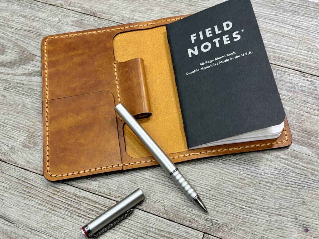 Personalisation will be stamped in the bottom right corner. Comes with a 48 page lined note pad inside. Completely handmade and hand stitched from beautiful vegetable tanned top grain Lyveden distressed leather. Constructed from multiple pieces of leather and carefully glued, sanded, stitched and the edges dyed to give a premium finish. Lined note pad can easily replaced when full. Ideal gift for him or her.