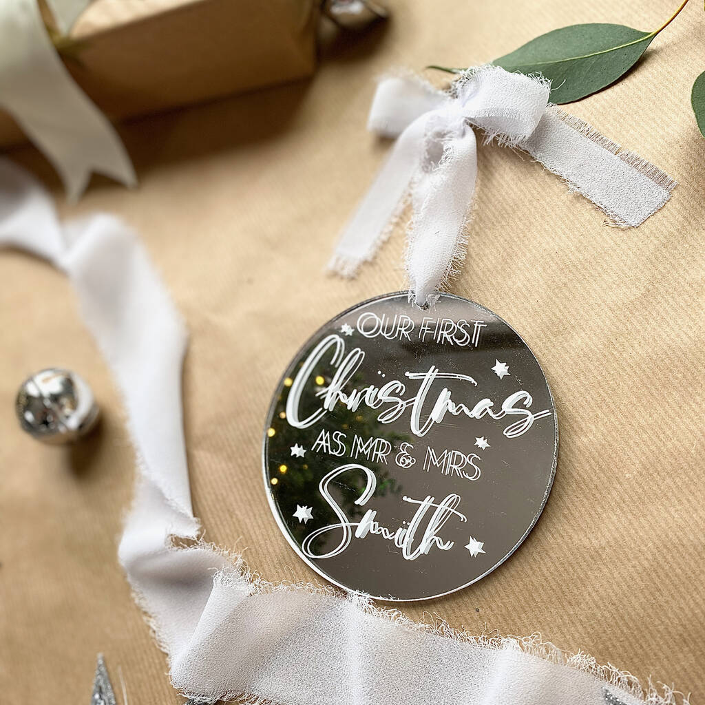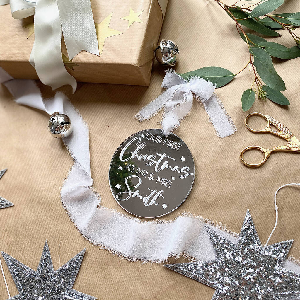 Celebrate a truly special milestone with these luxury personalised Christmas tree decorations, designed to mark a first Christmas as newlyweds!