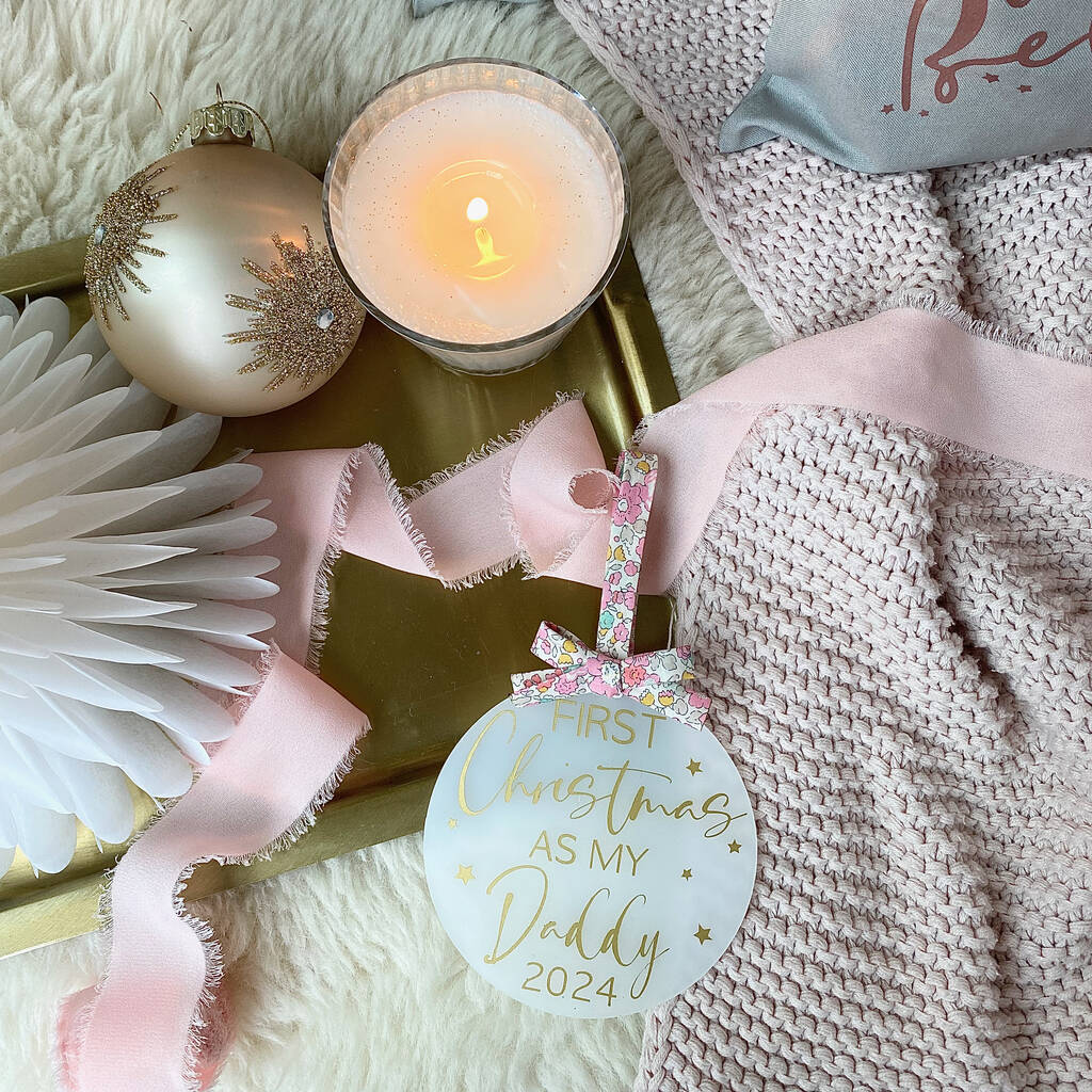 A luxury, personalised 'first Christmas as my...' tree decoration with choice of chiffon ribbon or Liberty fabric.
