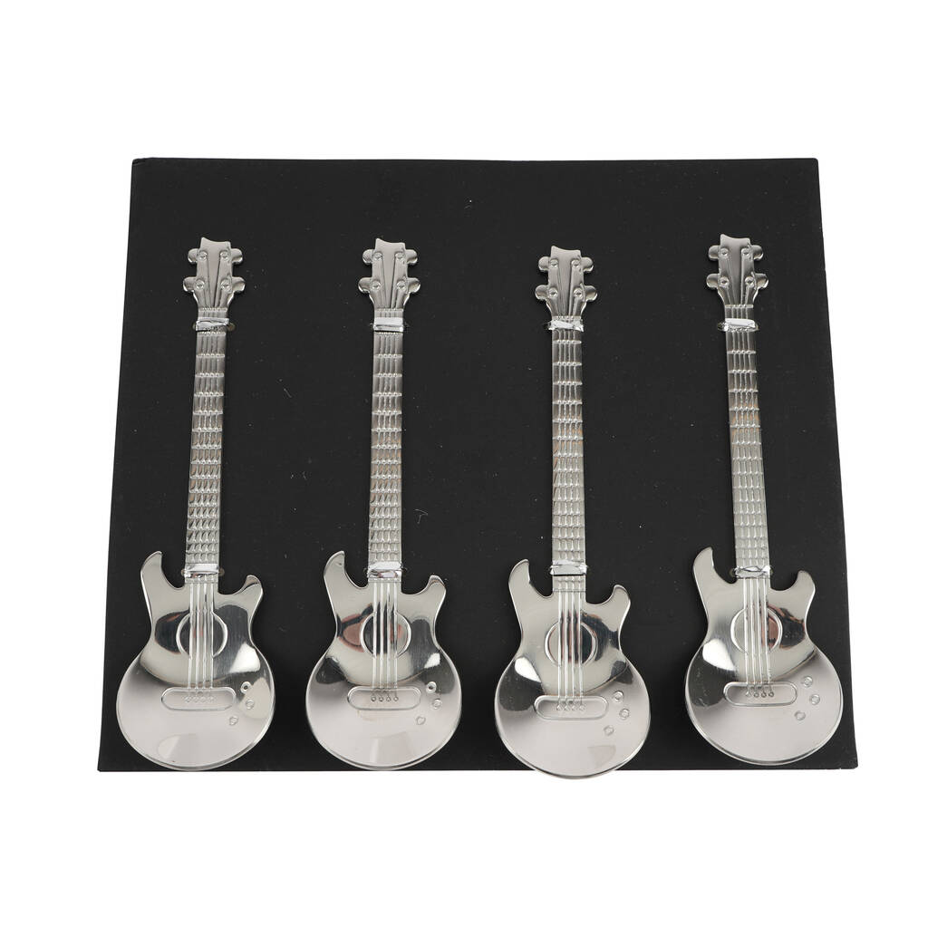 The set includes four individual spoons, each designed with a different guitar style for a fun and varied look. These are dishwasher safe.