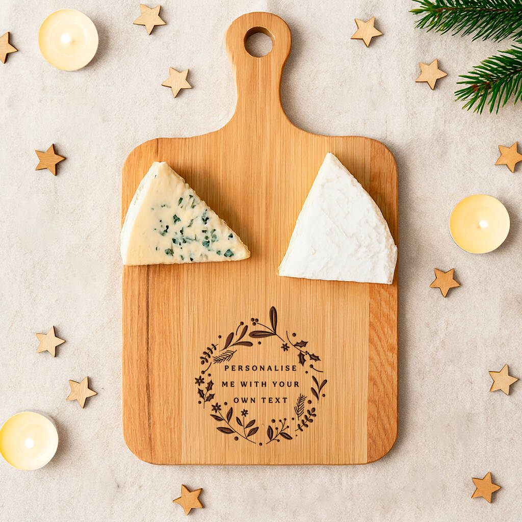 This charming cheeseboard features a beautifully engraved mistletoe and holly illustration, capturing the spirit of the season. At the centre, there’s space for you to personalise with your own text — whether it’s a family name, a festive message, or something uniquely yours. This bespoke detail makes each board truly one-of-a-kind, adding warmth and character to Christmas celebrations or everyday entertaining.