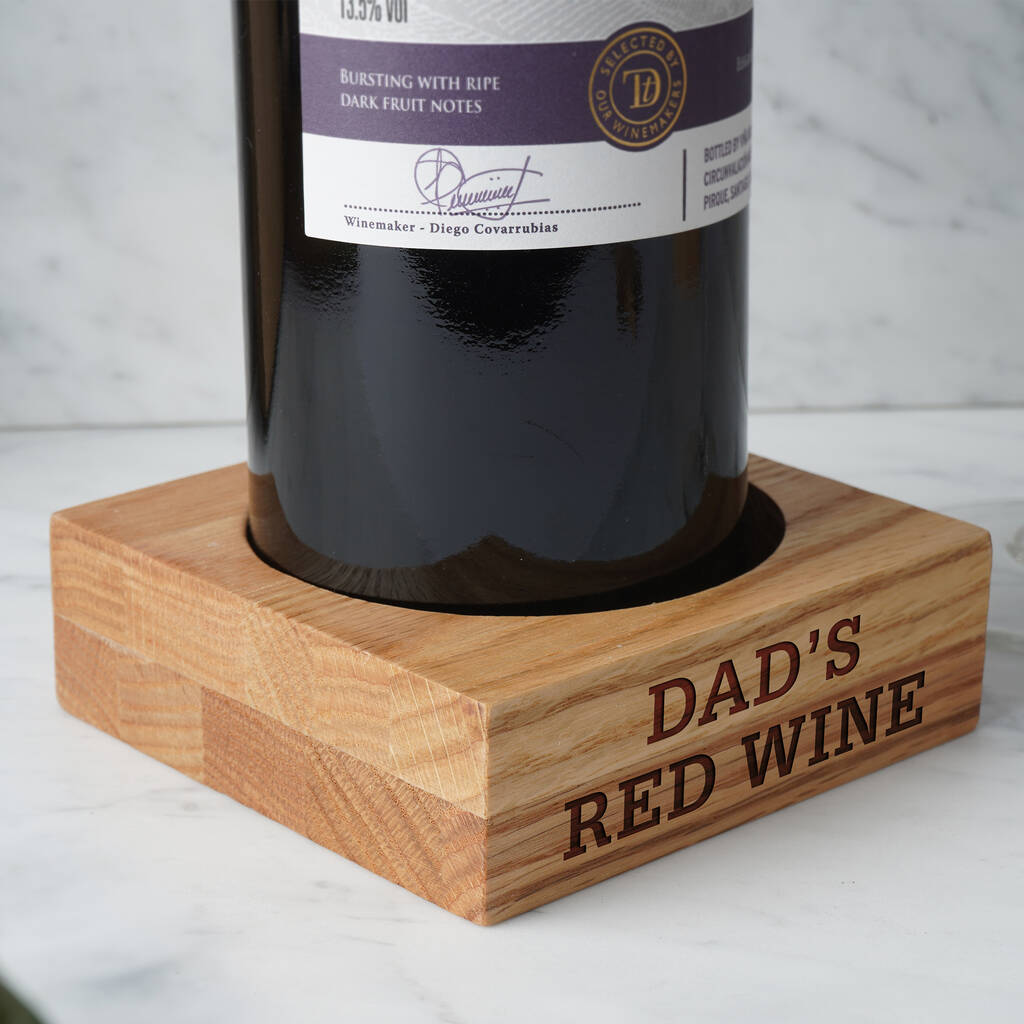 Made from high-quality oak, the piece has a natural finish that highlights the grain and texture of the wood, giving it a timeless look that complements both traditional and modern interiors. The square design ensures stability while keeping the bottle securely in place, making it ideal for displaying on a shelf, countertop, or dining table.