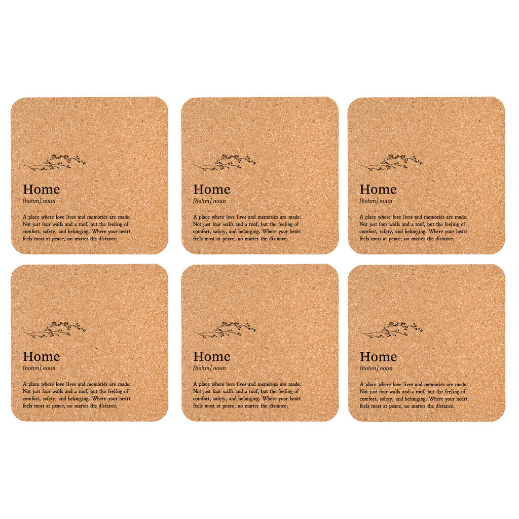 Introducing our set of six square cork coasters featuring the word “Home” — designed to bring comfort, simplicity, and natural charm to your living space