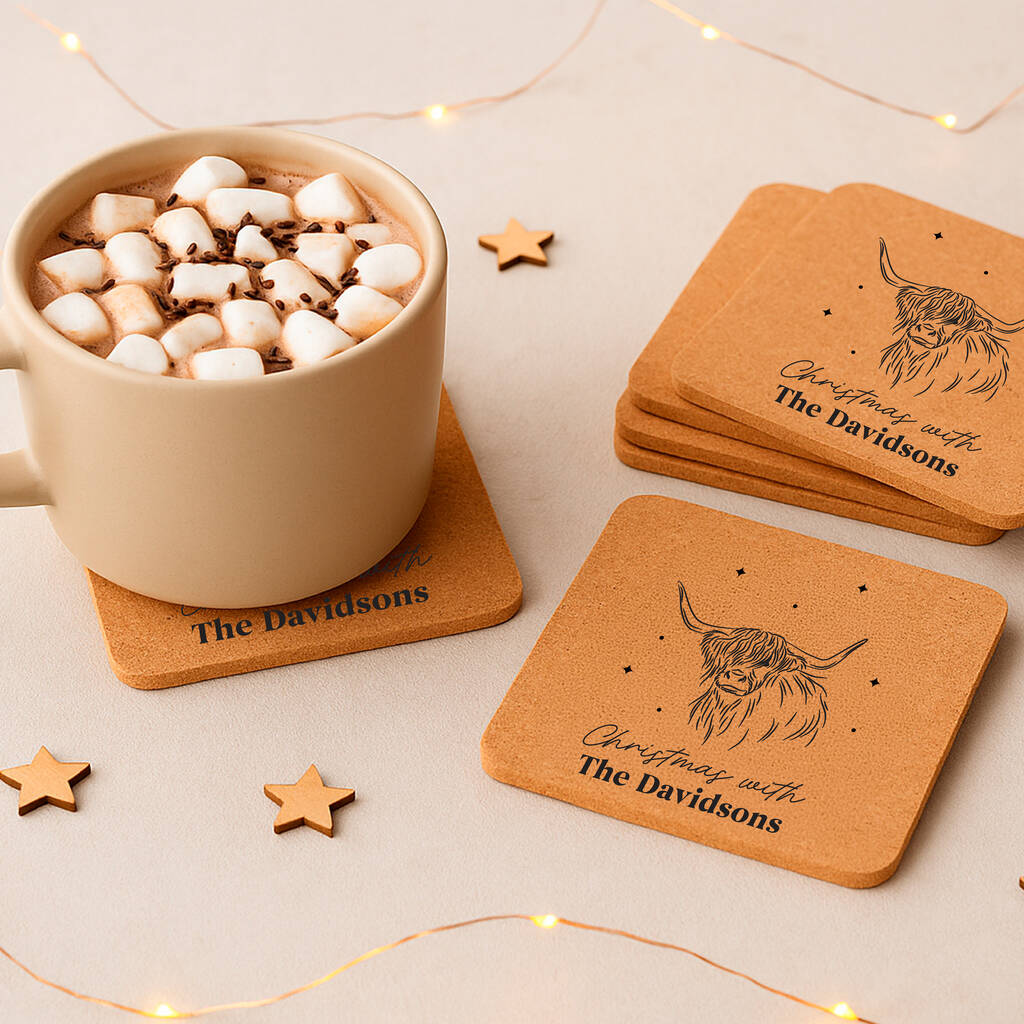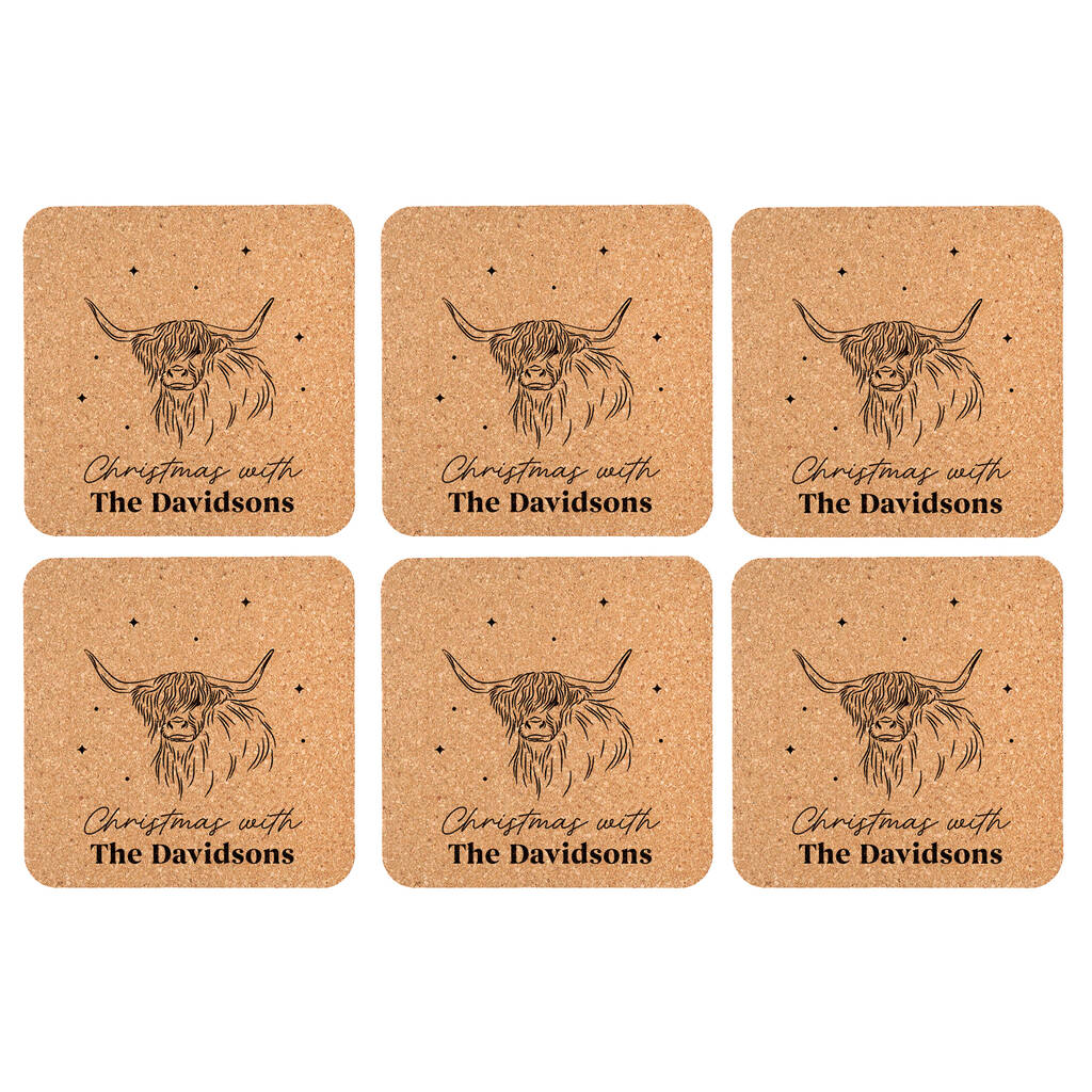 Set Of Six Highland Cow Personalised Cork Coasters