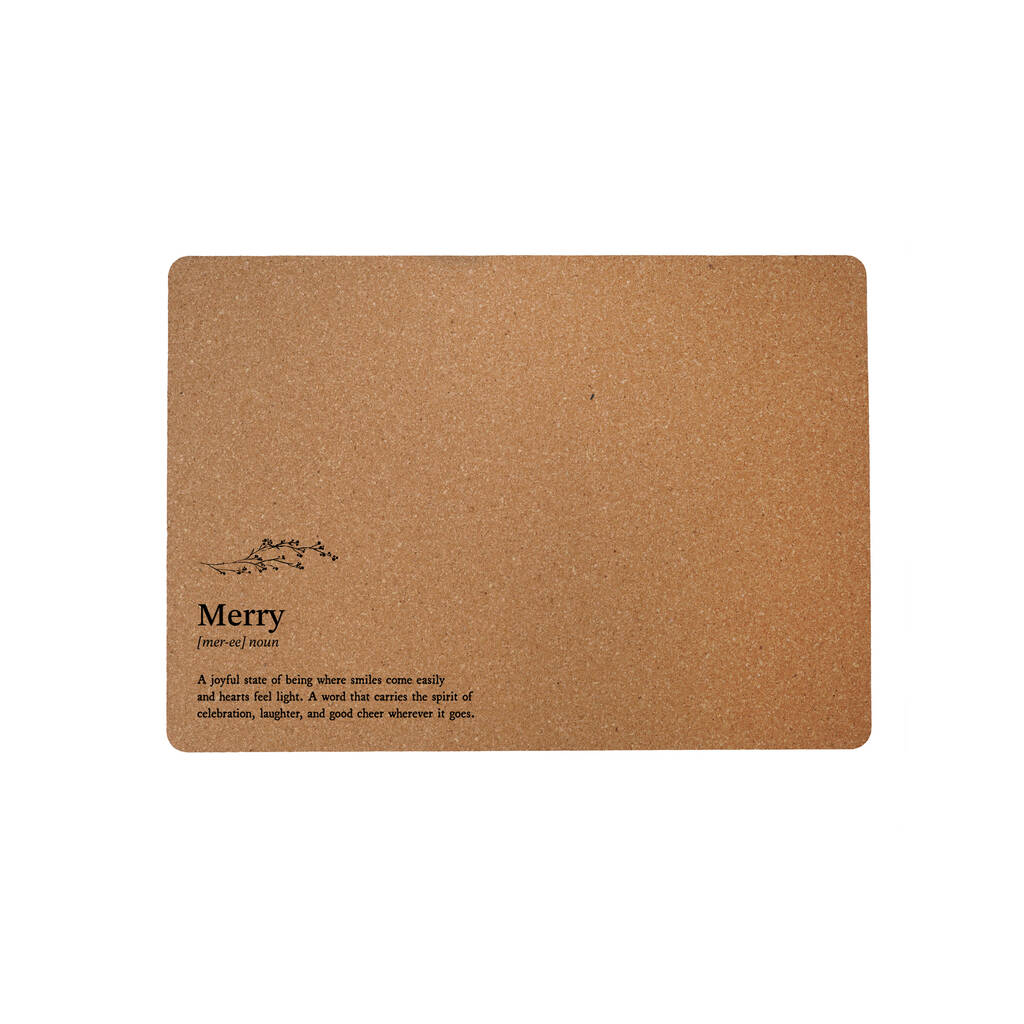 A festive set of six rectangular cork placemats featuring the slogan “Merry” — designed to bring warmth and seasonal charm to your dining table