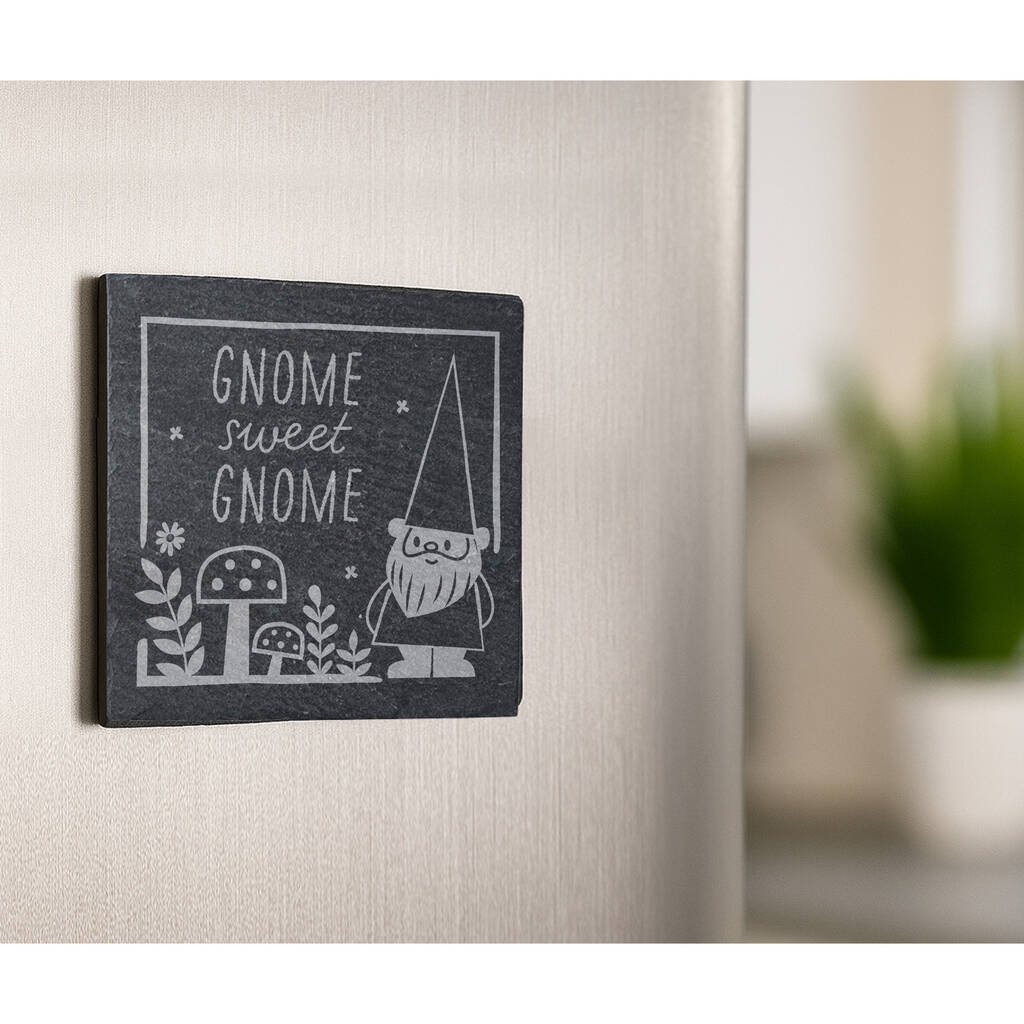 The design features the playful slogan: “Gnome Sweet Gnome” paired with a delightful gnome and toadstool illustration. The crisp white artwork stands out beautifully against the dark slate background, creating a fun and eye-catching decorative accent. Perfect for brightening fridges, garden sheds, or magnetic boards, this magnet blends practical use with garden-inspired style.