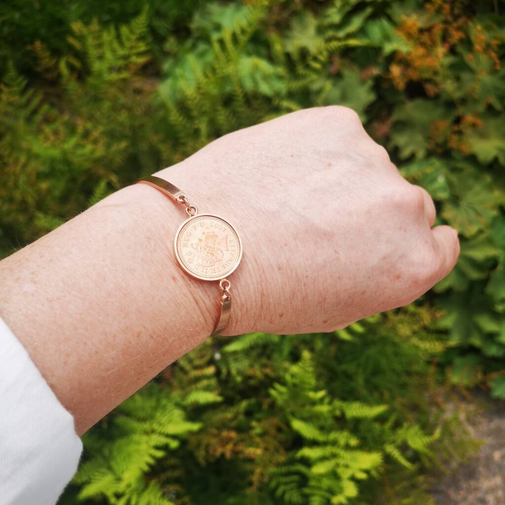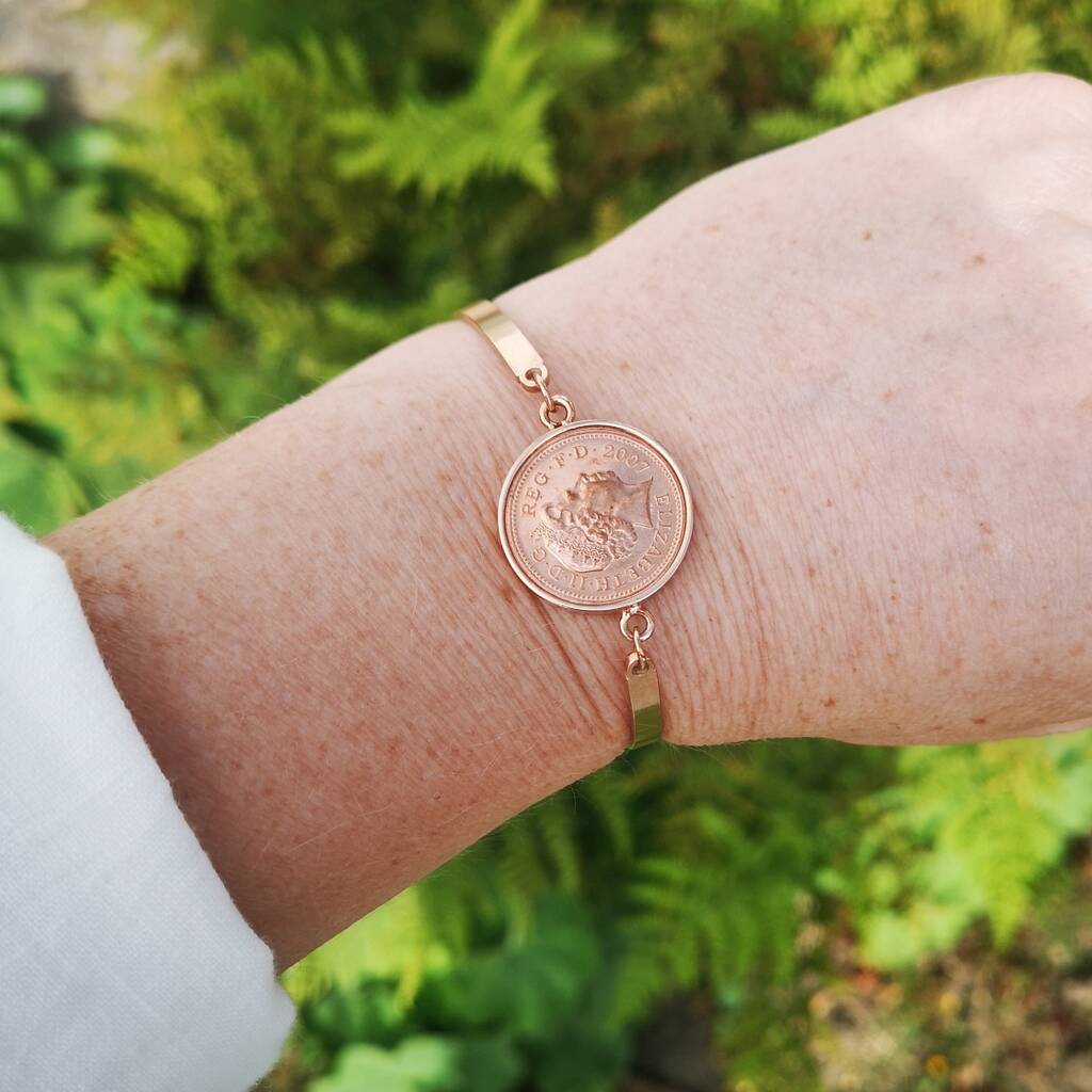 A minimalist 18th birthday one pence bracelet made with a beautifully polished 18th birth date one pence coin.