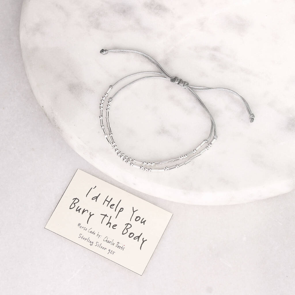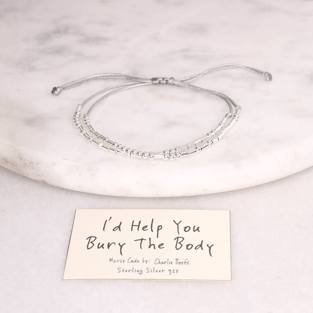 A Morse code bracelet that spells 'I'd help you bury the body' in dots and dashes, available in silver or rose gold colour.