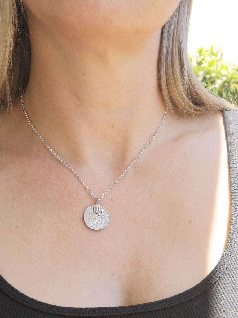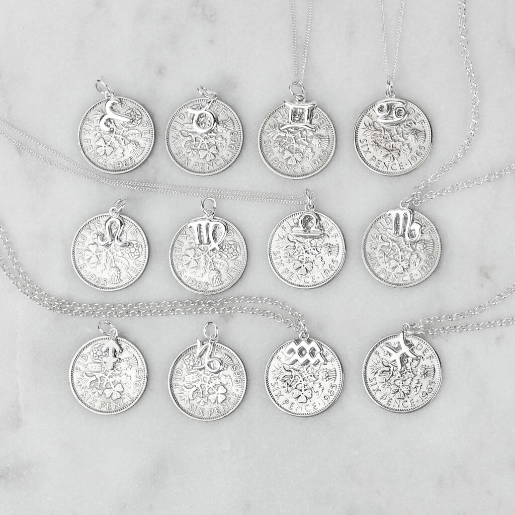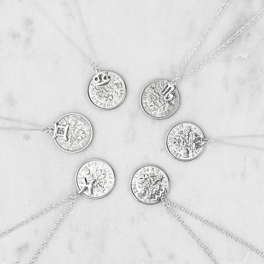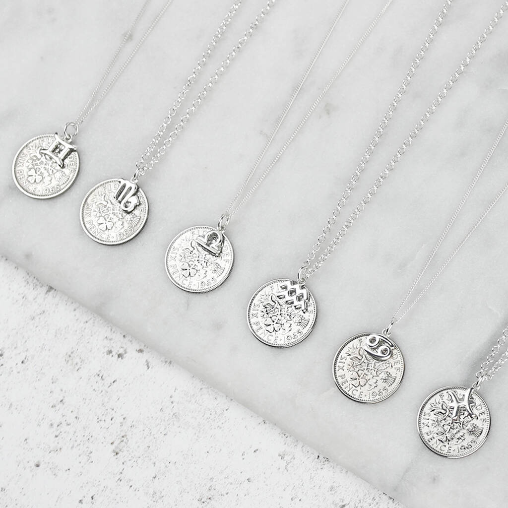 The sixpence is traditionally known to bring good fortune. Decorated with a sterling silver zodiac charm, it creates a thoughtful blend of heritage and personal symbolism.