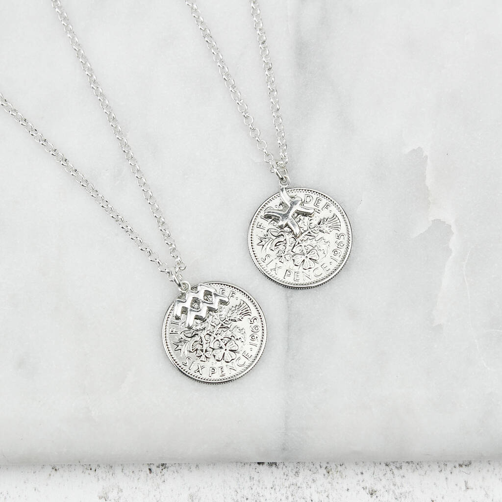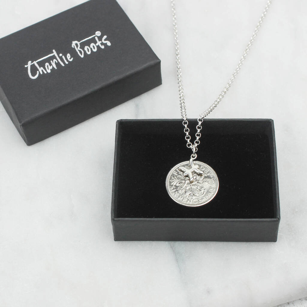 Each necklace features a genuine British sixpence dated 1955, perfect for a 70th birthday gift . A vintage and contemporary coin gift.