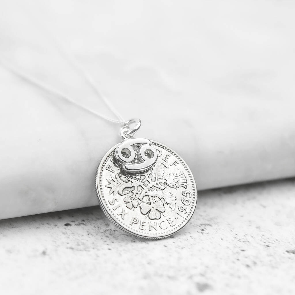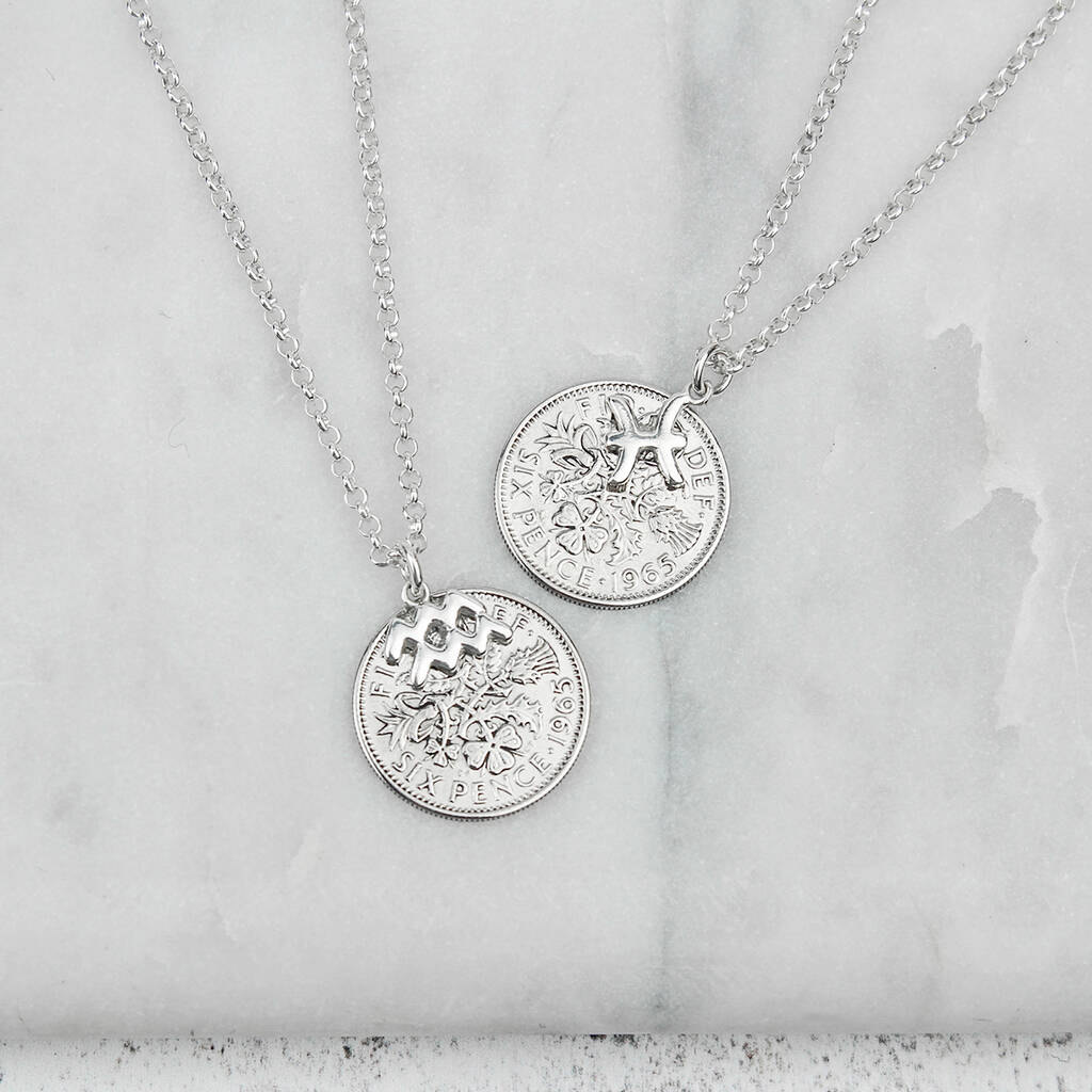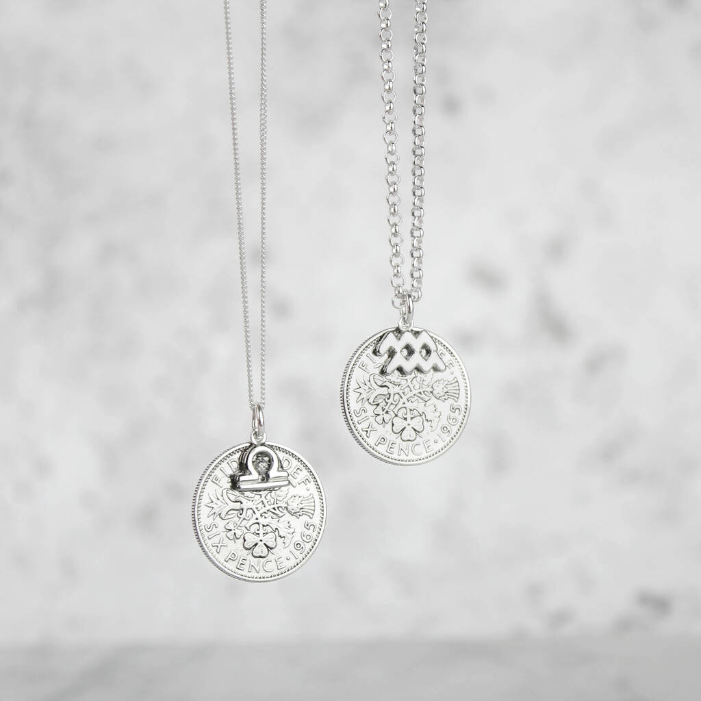 A minimalist sterling silver 70th birthday necklace displaying your chosen star sign and a 70th birthday sixpence.