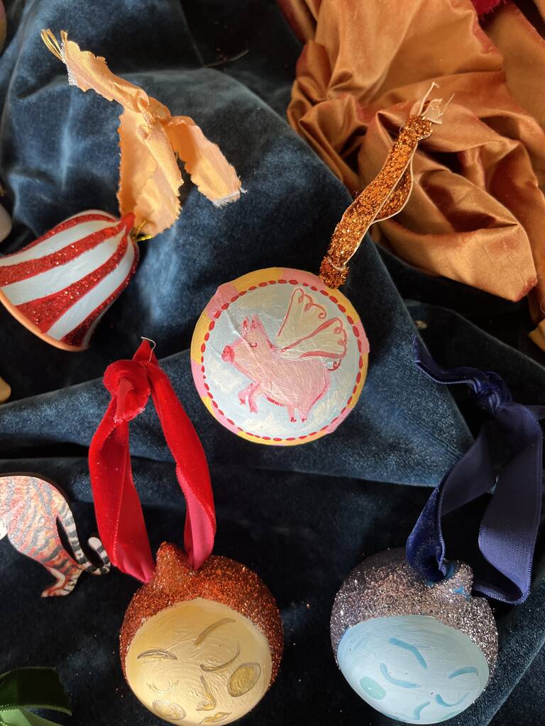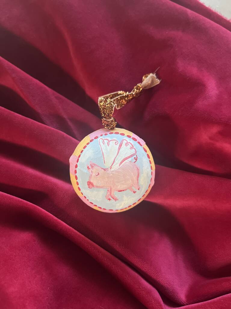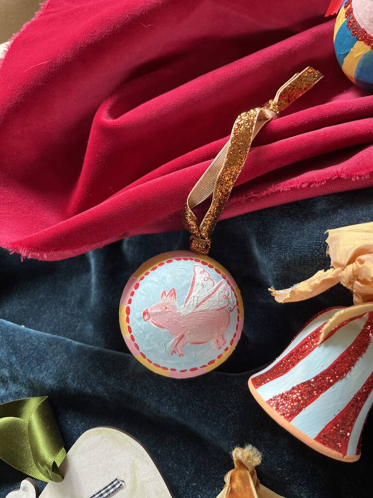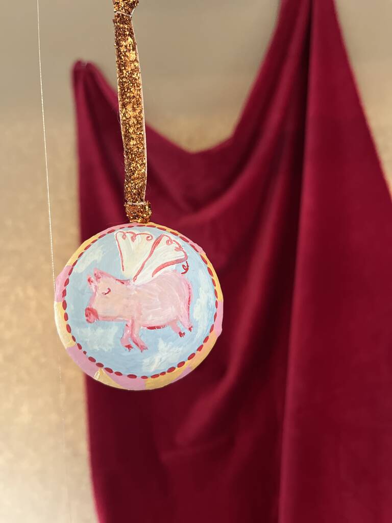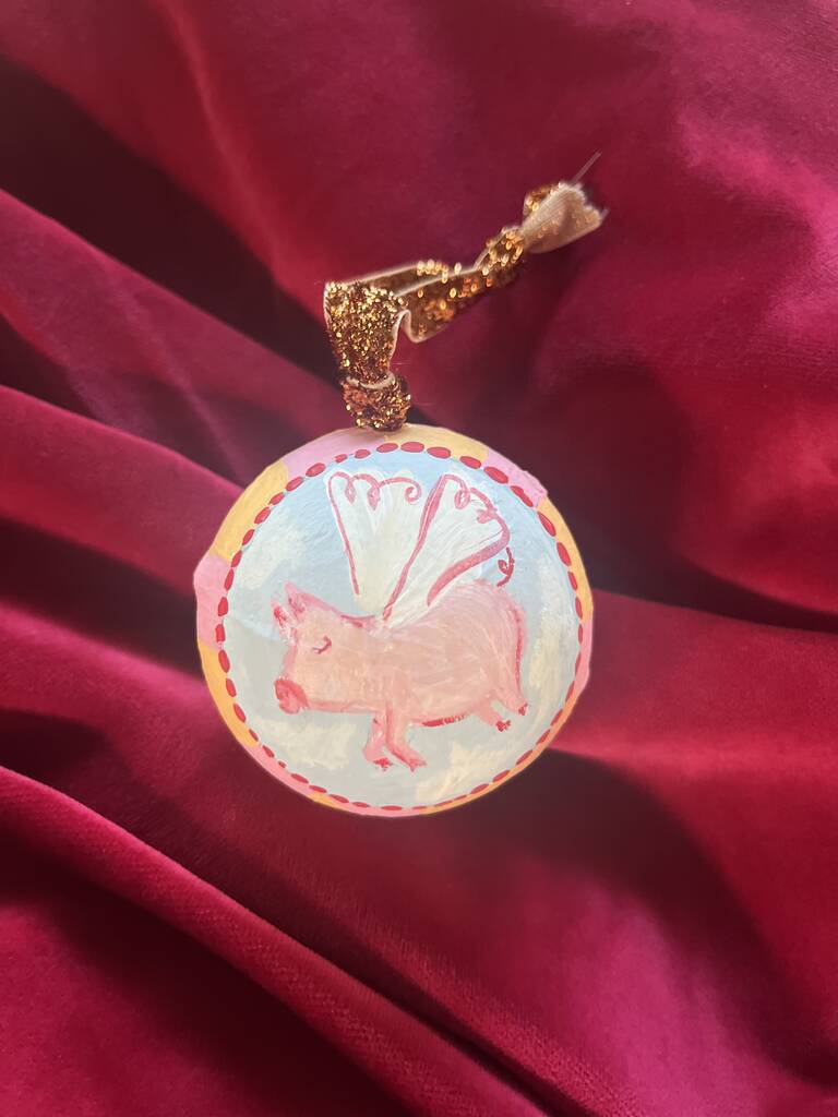 A hand-painted papier-mâché bauble featuring a whimsical flying pig on a checked orange and pink background, finished with a sparkling copper ribbon.