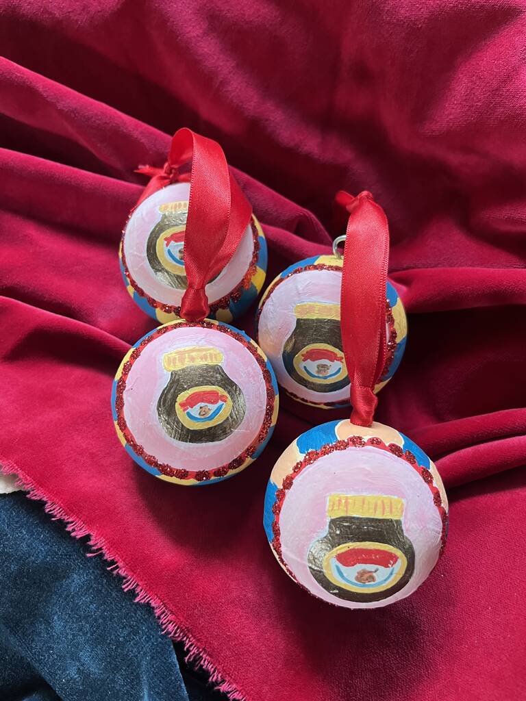 A personalised papier mache bauble, hand painted in teal and yellow stripes with a painted marmite jar in the centre with red ribbon.