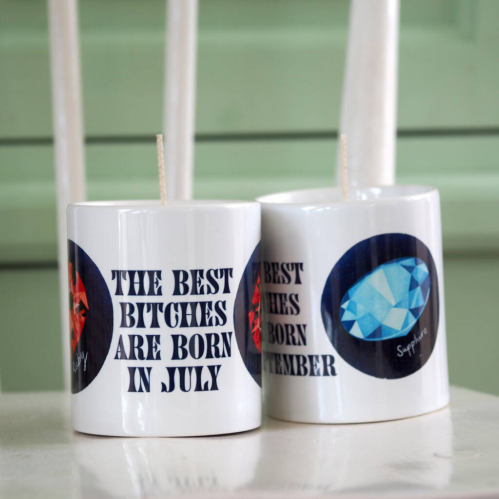 Bring some cheeky charm to her birthday! Each candle pairs a birthgem illustration with the message "the best bitches are born in ... (birthmonth)".
