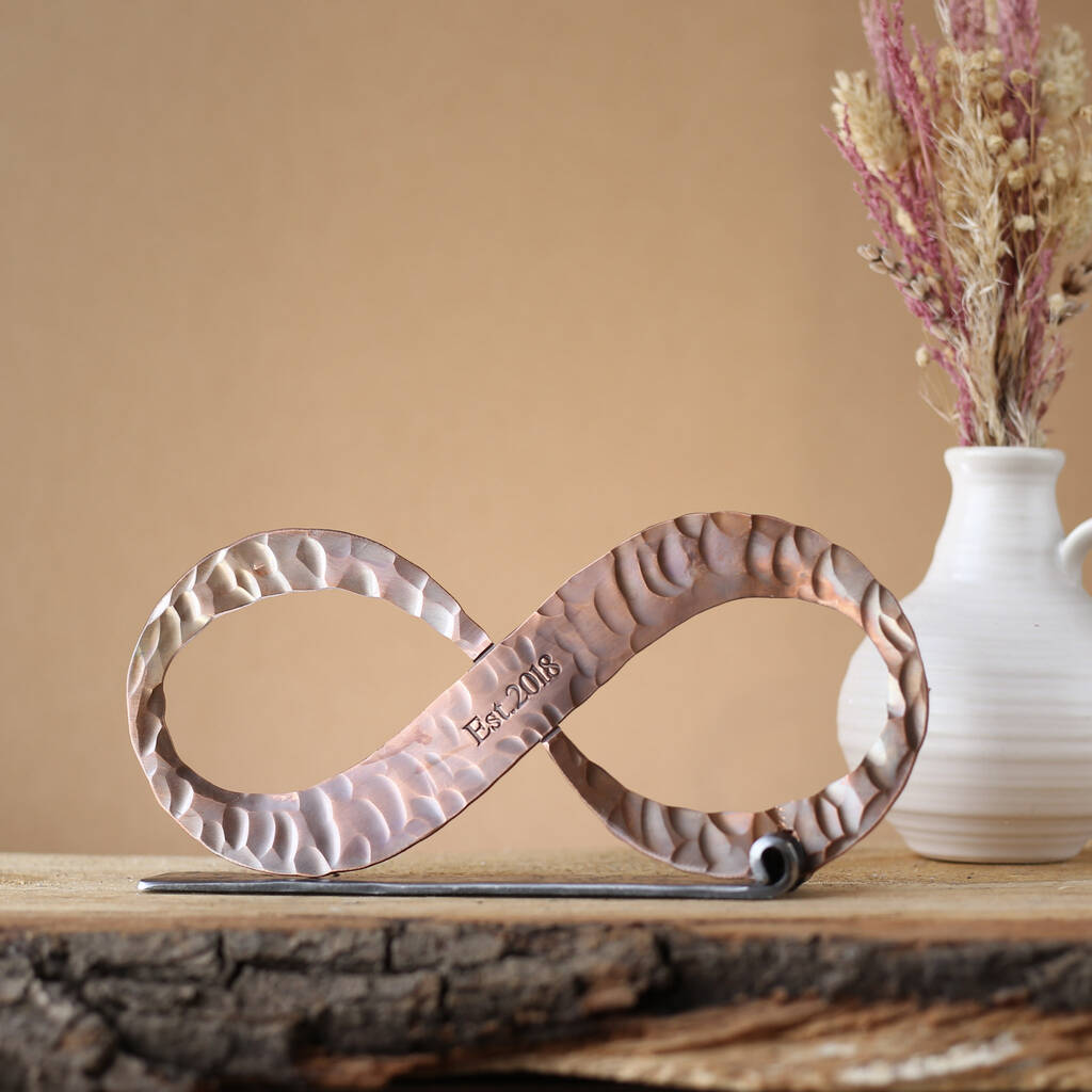 Mark this special milestone with a timeless copper infinity knot sculpture—an elegant symbol of unbreakable love and connection. Thoughtfully crafted, this piece reimagines tradition with a sleek, contemporary twist.